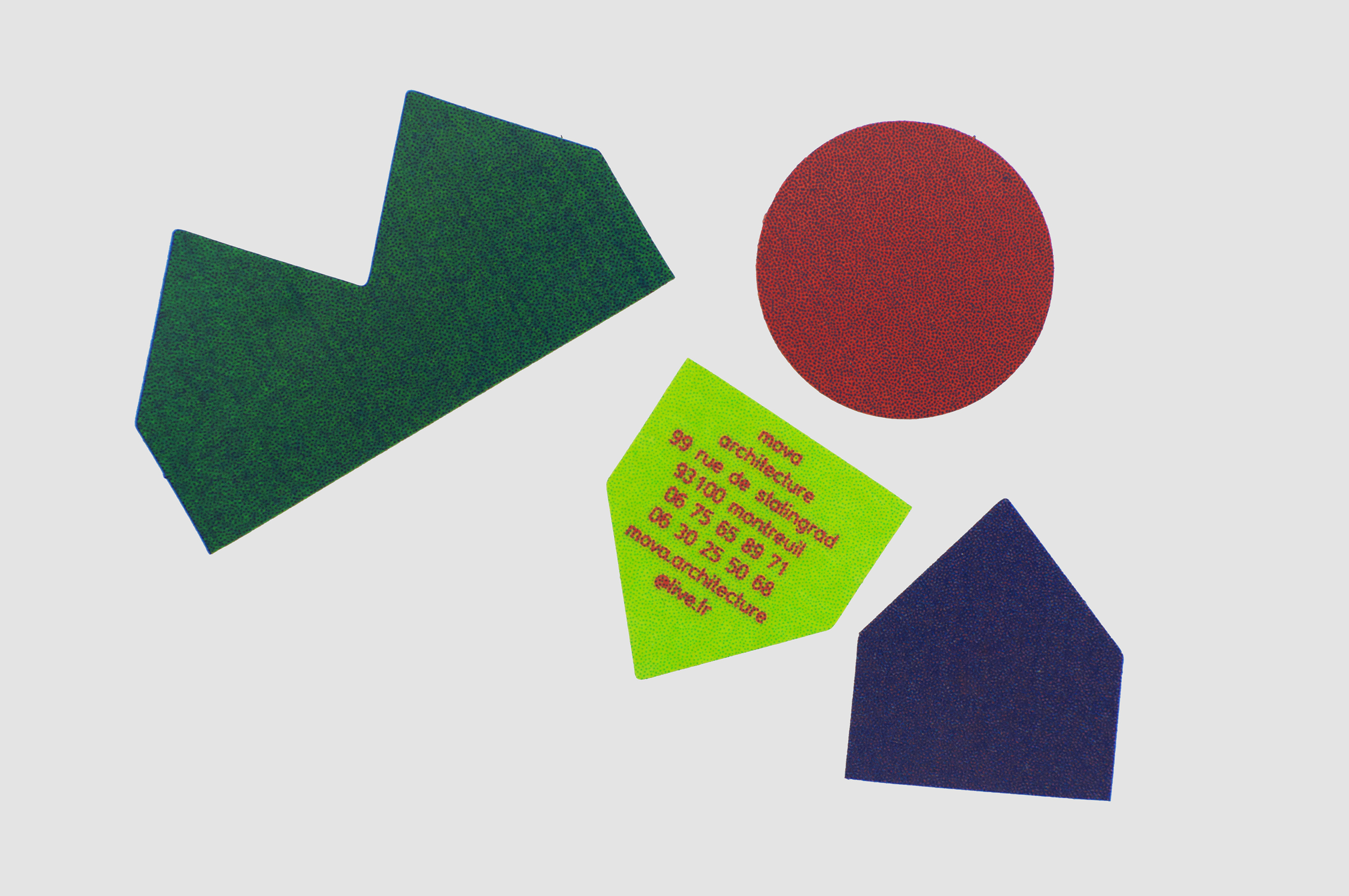 Mova is an architectural firm that works on various scale projects with simplicity, poetry and respect for the environment. The graphic identity is progessive. The 4 letters of the word Mova recall architectural and landscape basics: houses, factory, sun. I wanted the graphic identity to work like a toolbox that the client could use differently for each media, in order to constantly recompose this mini-landscape, like a game. Pre-cut stickers were printed in order to be added and bring some contrast to any corporate media (manila envelope, card cards…) or on a larger scale on building permits panels.