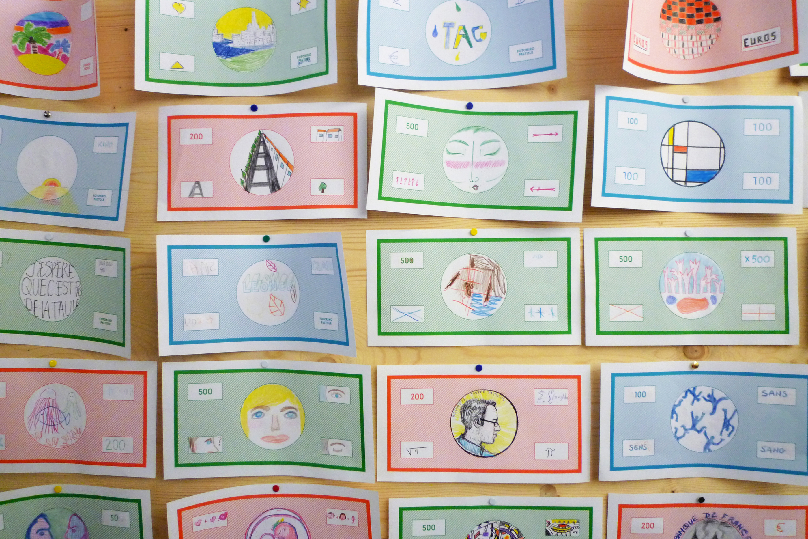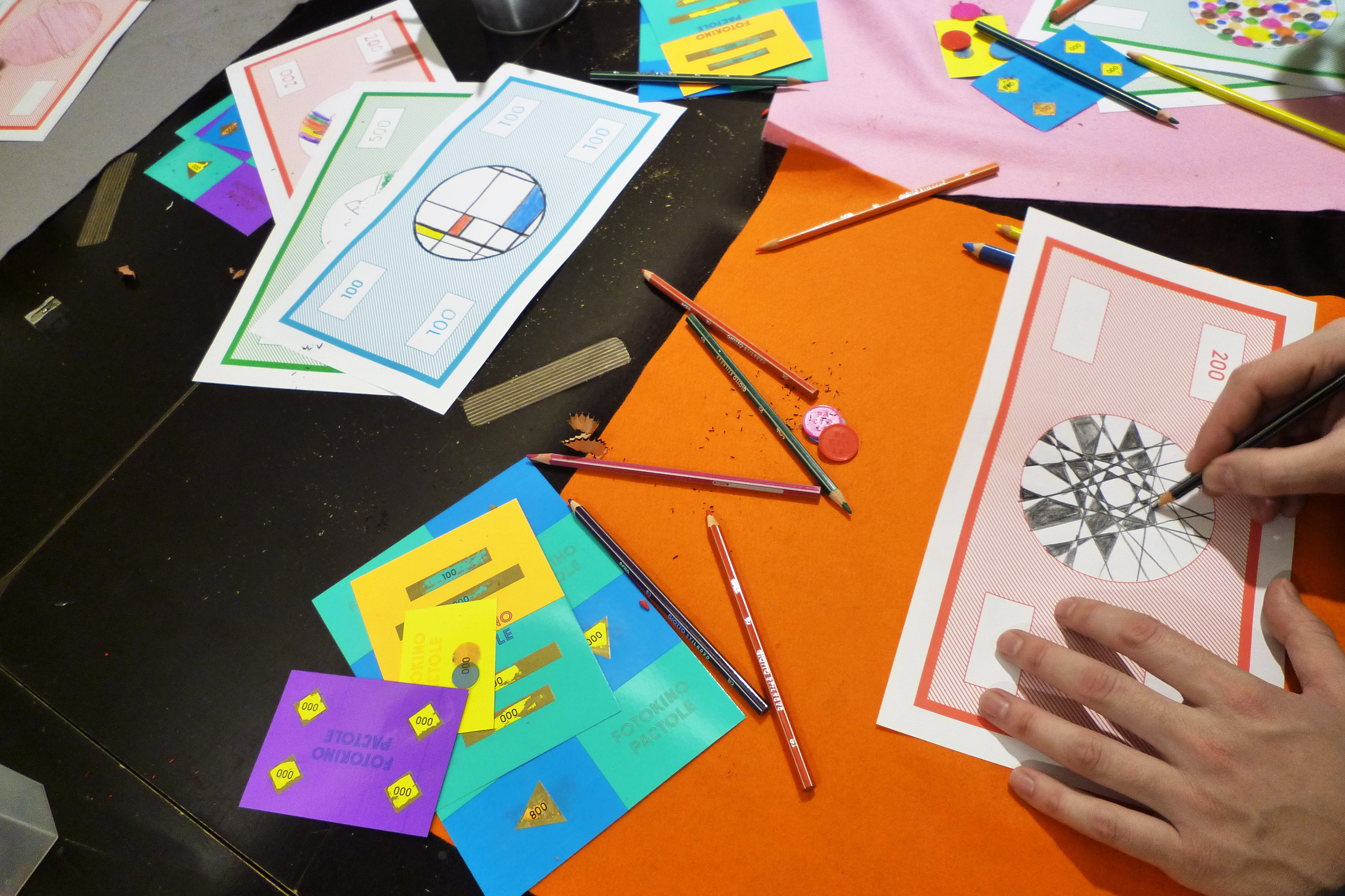 This workshop was designed to invite visitors to participate in a colorful game of luck. Scratch cards, revealing various colorful shapes, allowed participants the chance to win “bank notes” that they could then finish by coloring them. Once colored, they could be put back into use, as the value increased, once in circulation. Visitors could buy scratch off tickets other to win the “Jackpot” (the meaning of the word Pactole in French): a big RISO-printed check, hand-finished by yours truly!