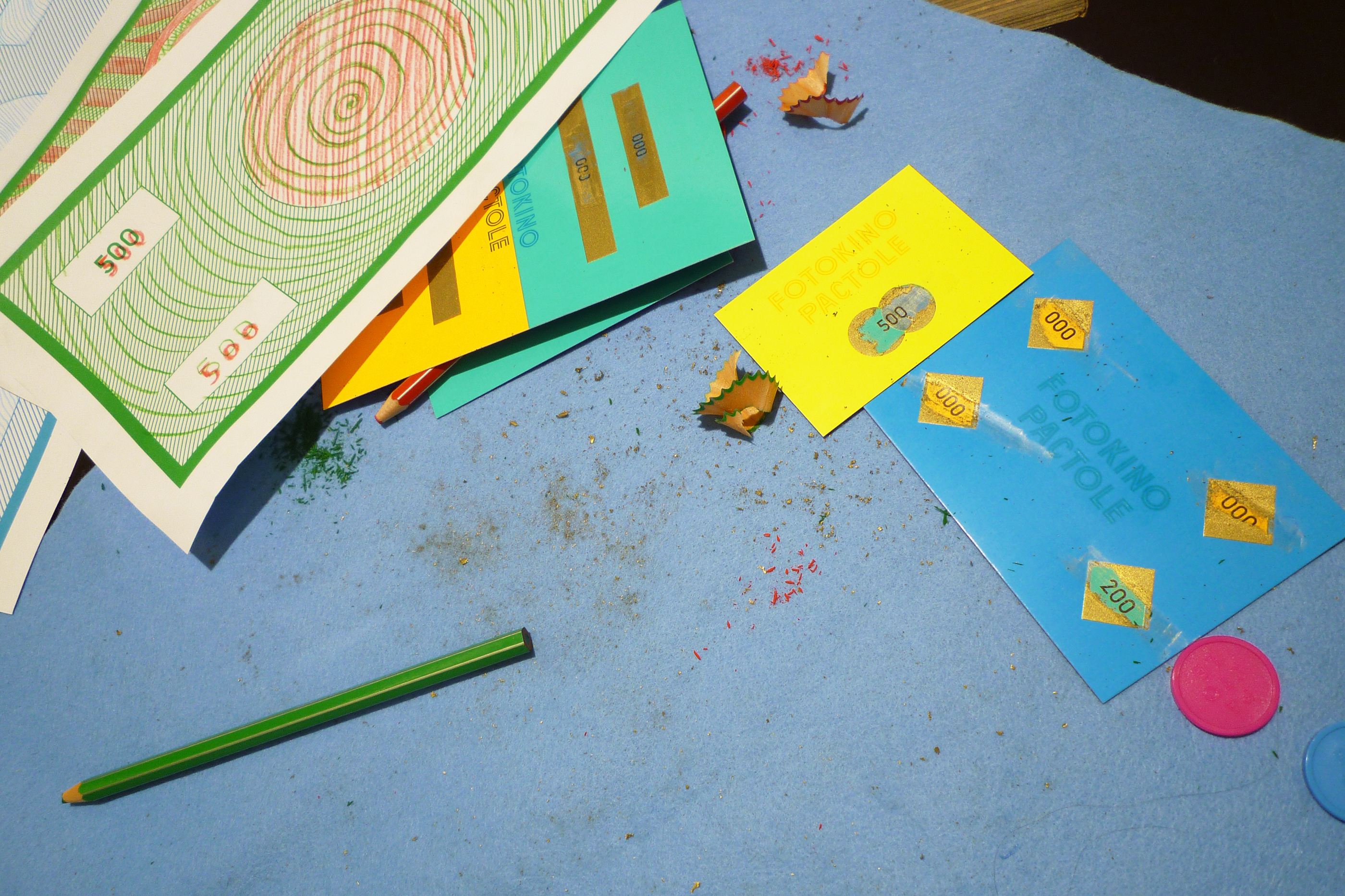 Cet atelier propose aux visiteurs de participer à un jeu de hasard coloré. Des tickets à gratter, révélant diverses formes colorées, permettent de gagner des «billets de banque» à colorier. Une fois coloriés, ceux-ci peuvent être remis en circulation, car ils acquièrent de la valeur. Les visiteurs peuvent racheter d’autres tickets grattables pour décrocher le Pactole: un gros chèque imprimé en riso et rempli à la main par mes soins!
