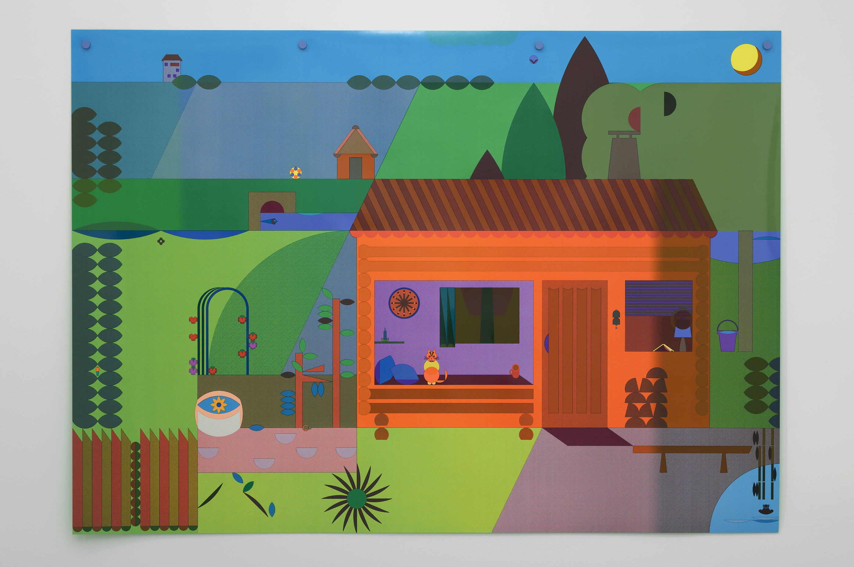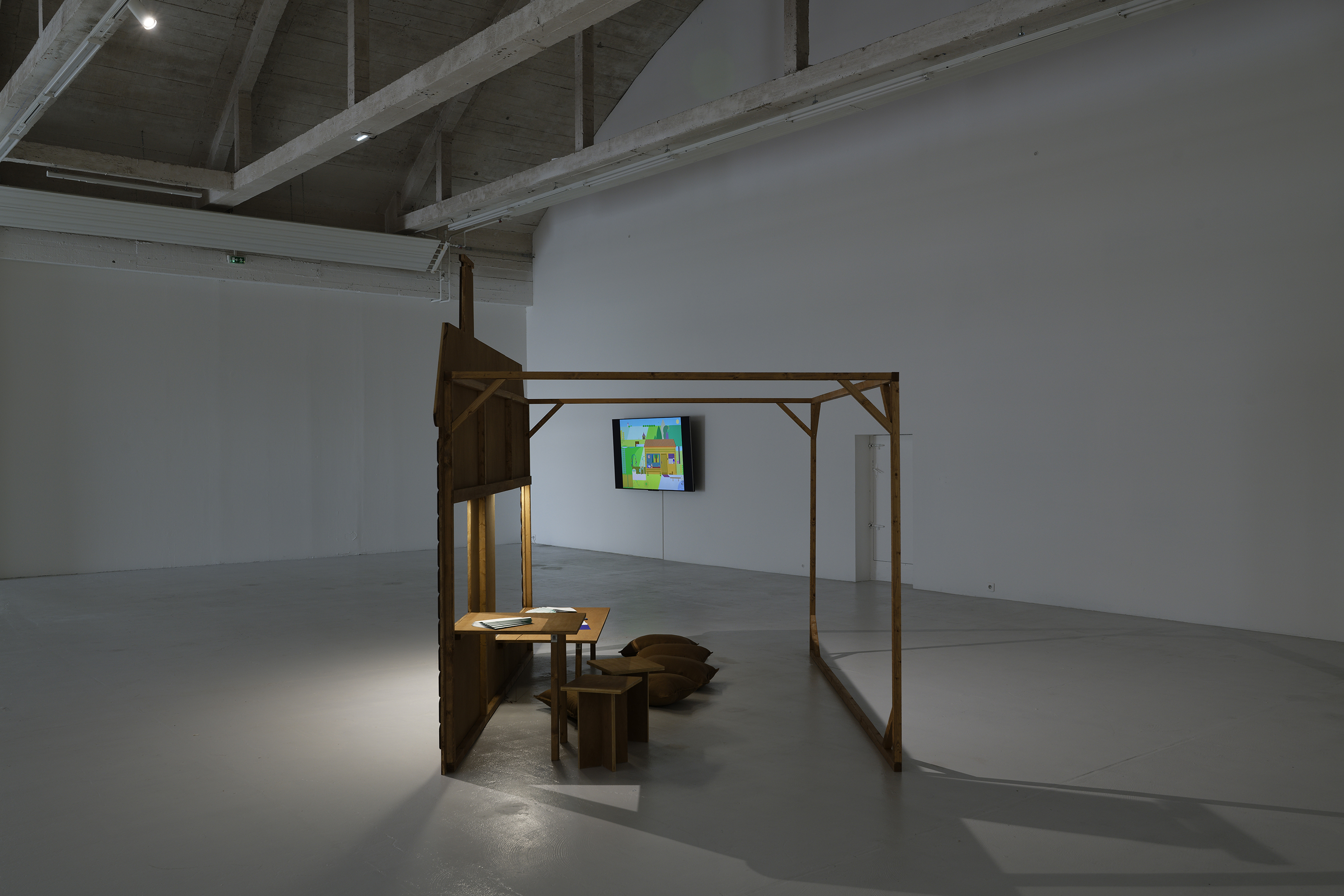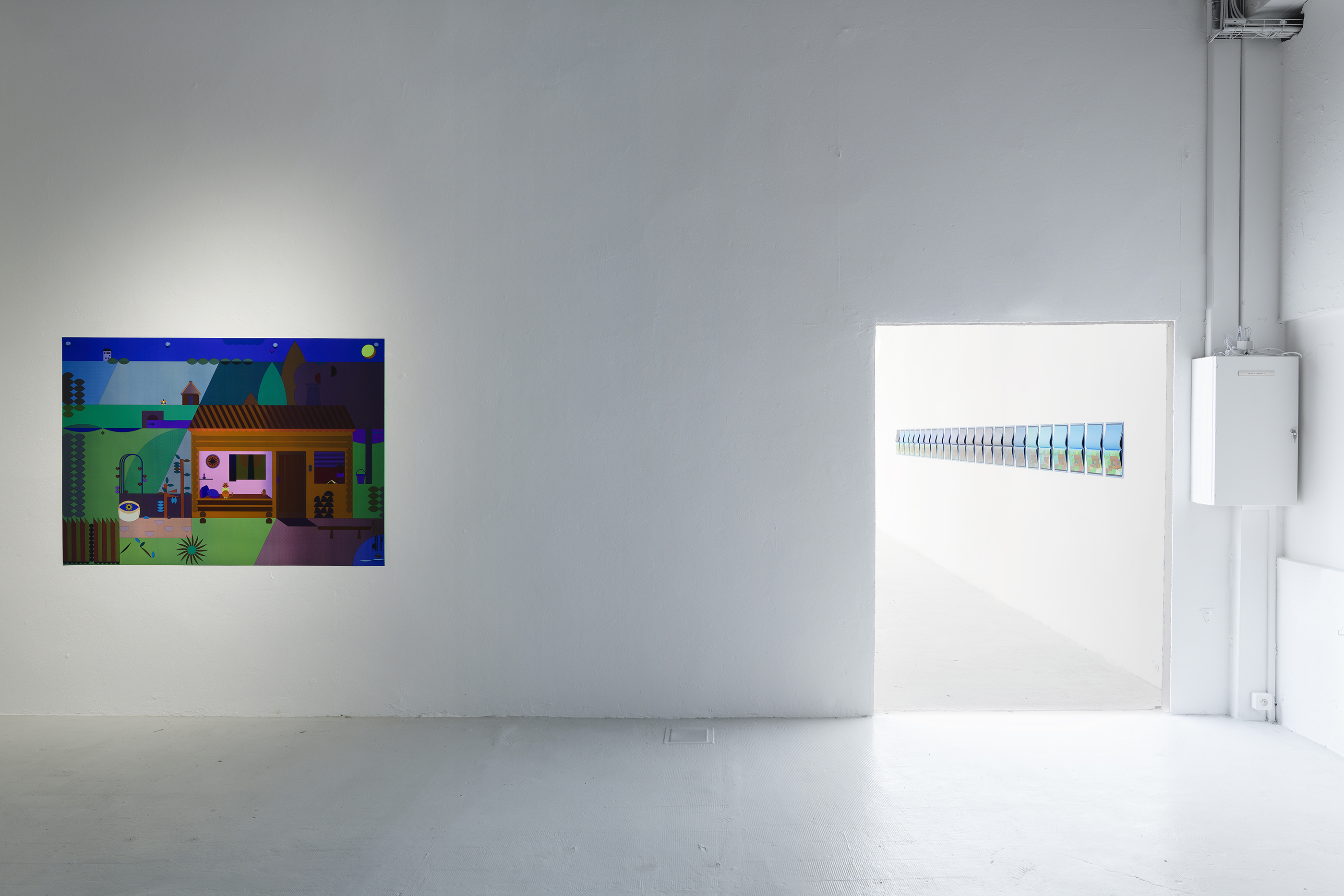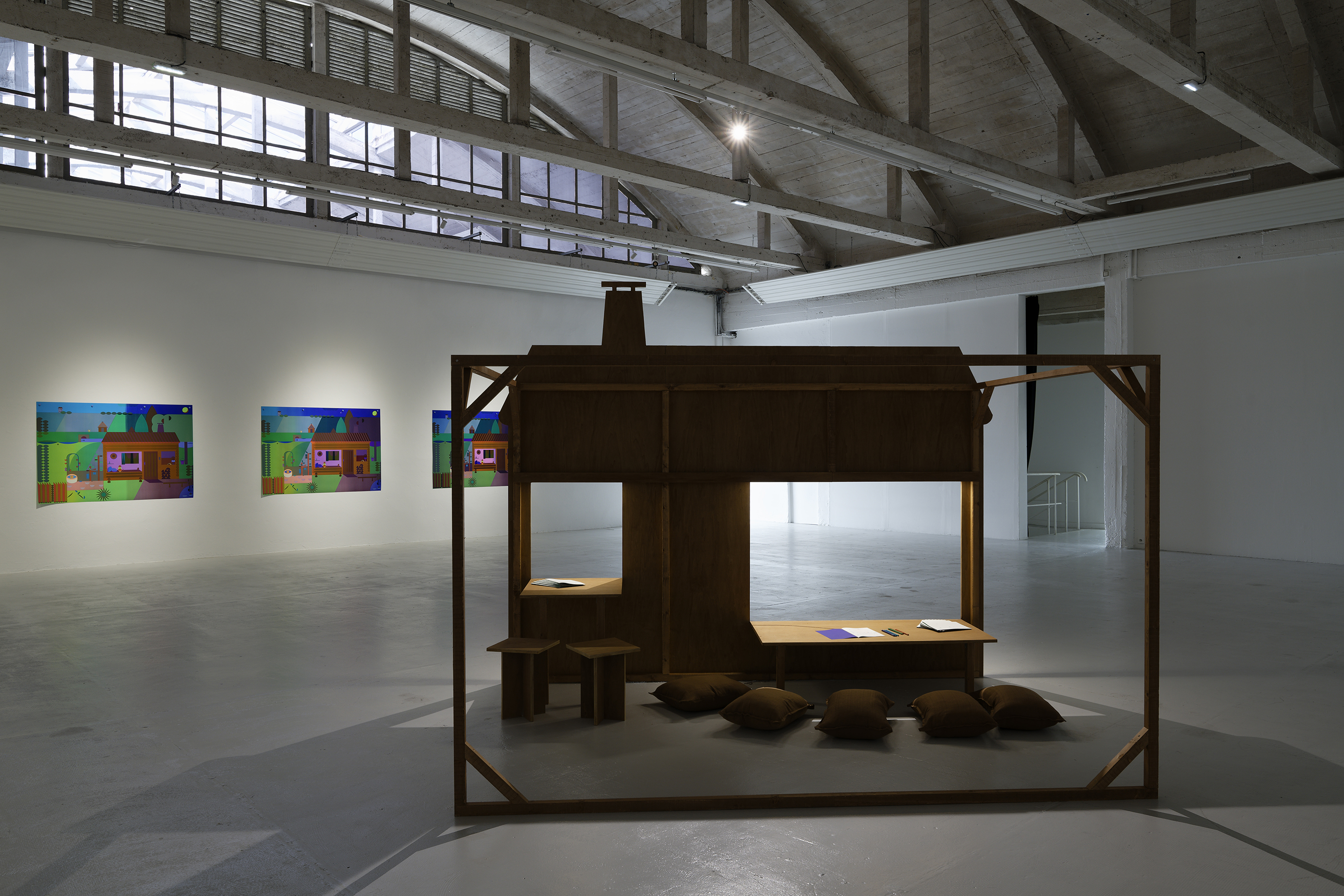 The exhibition at the Passerelle Centre for Contemporary Art, when the book and animated cartoon Panorama were presented, was an opportunity to adapt design to large-format screen printing. Here the magic of successive colour changes is conveyed, plunging the landscape into night and marking the passage of time. The little house, represented in the exhibition as a set, allows visitors to become part of the work, taking the colouring books published for the occasion so as to add their own touch of colour to the Panorama.