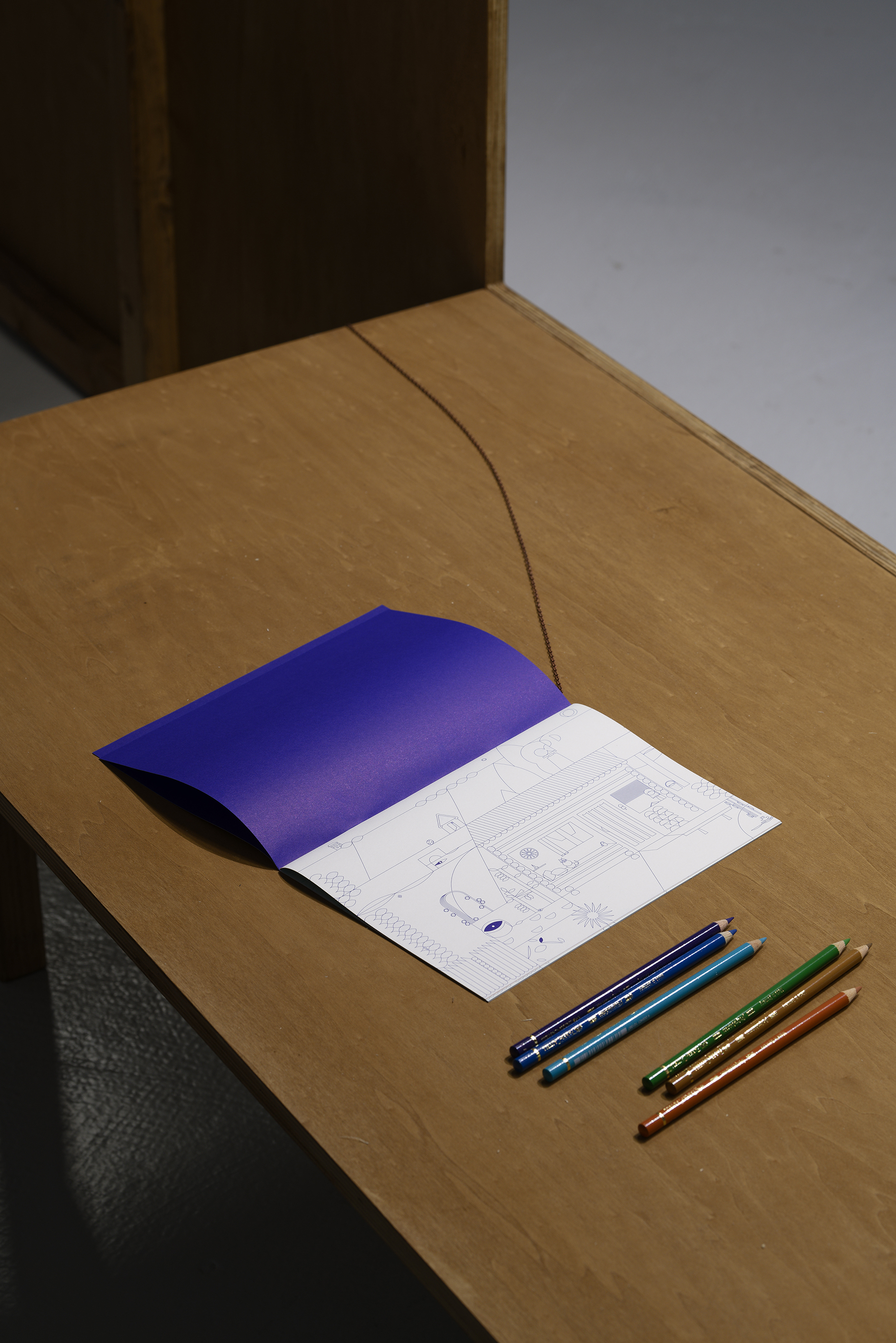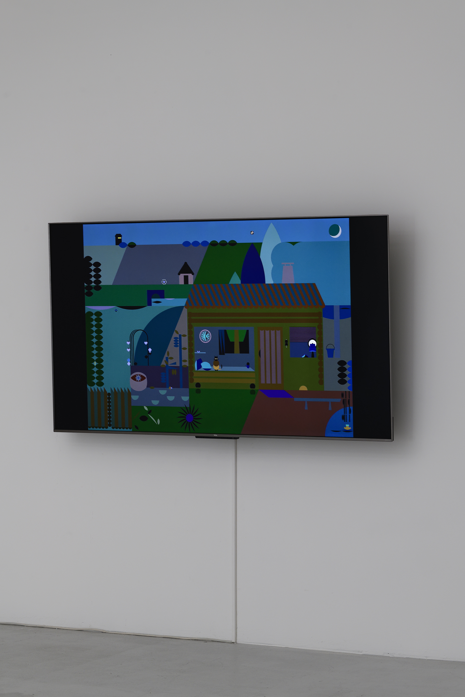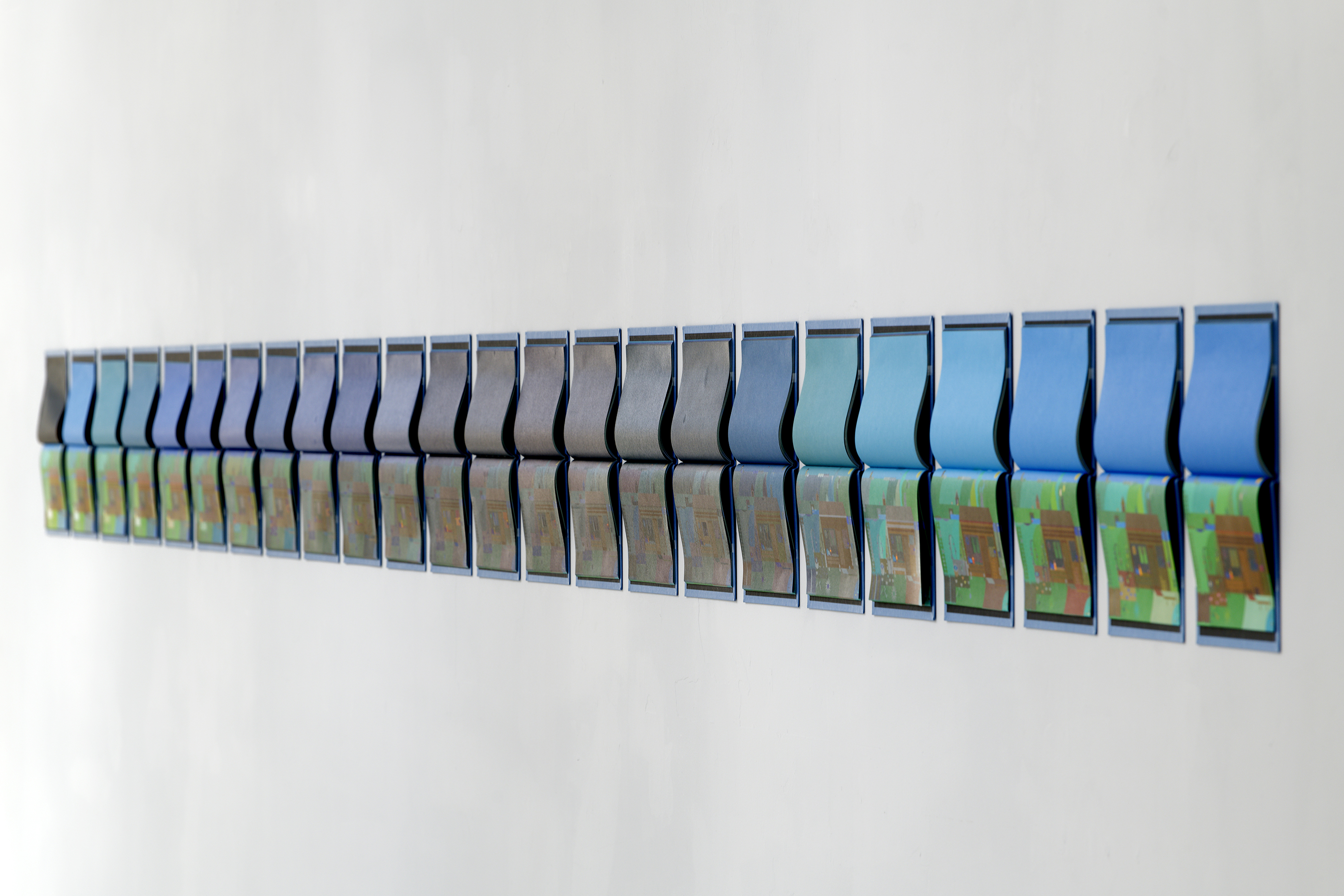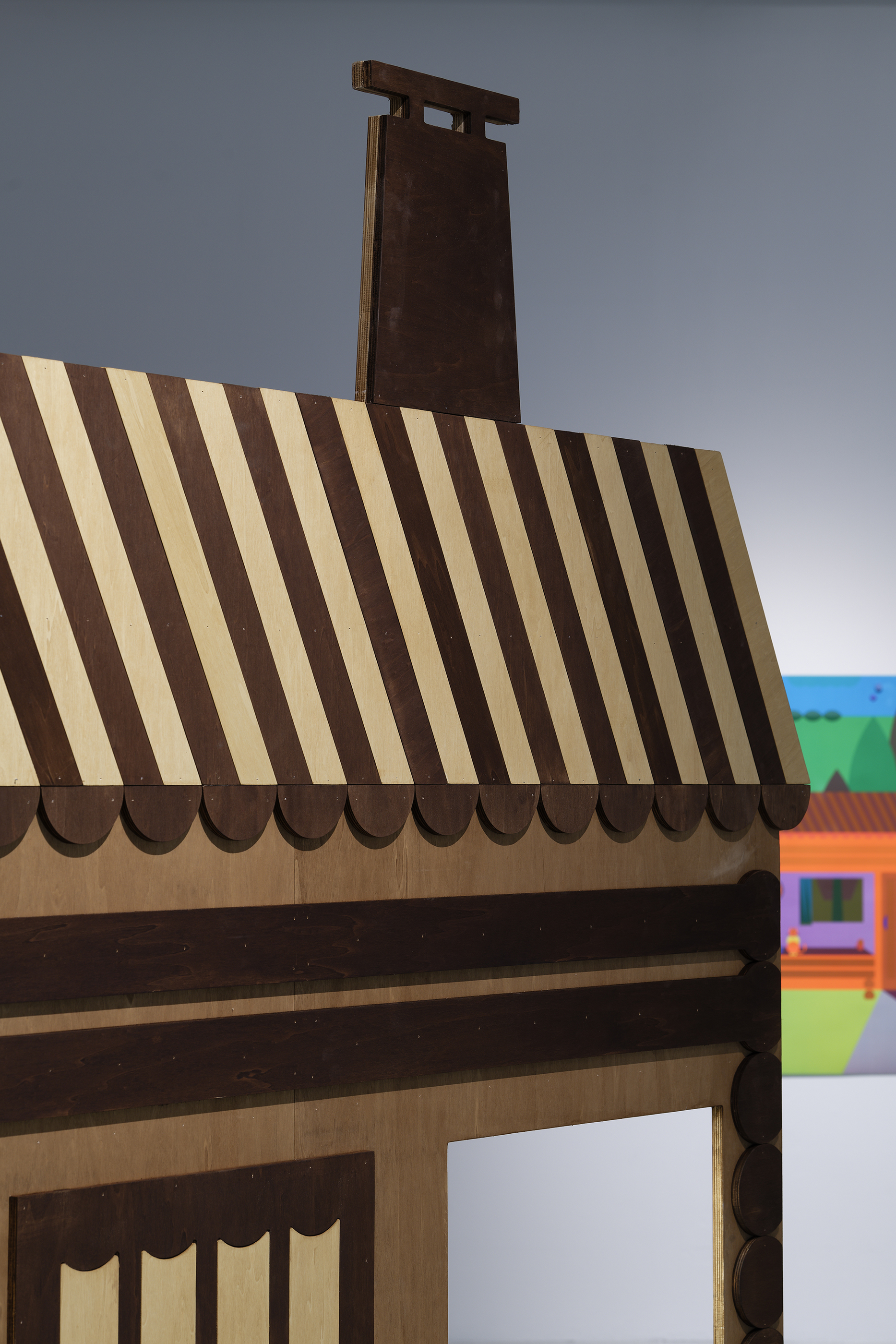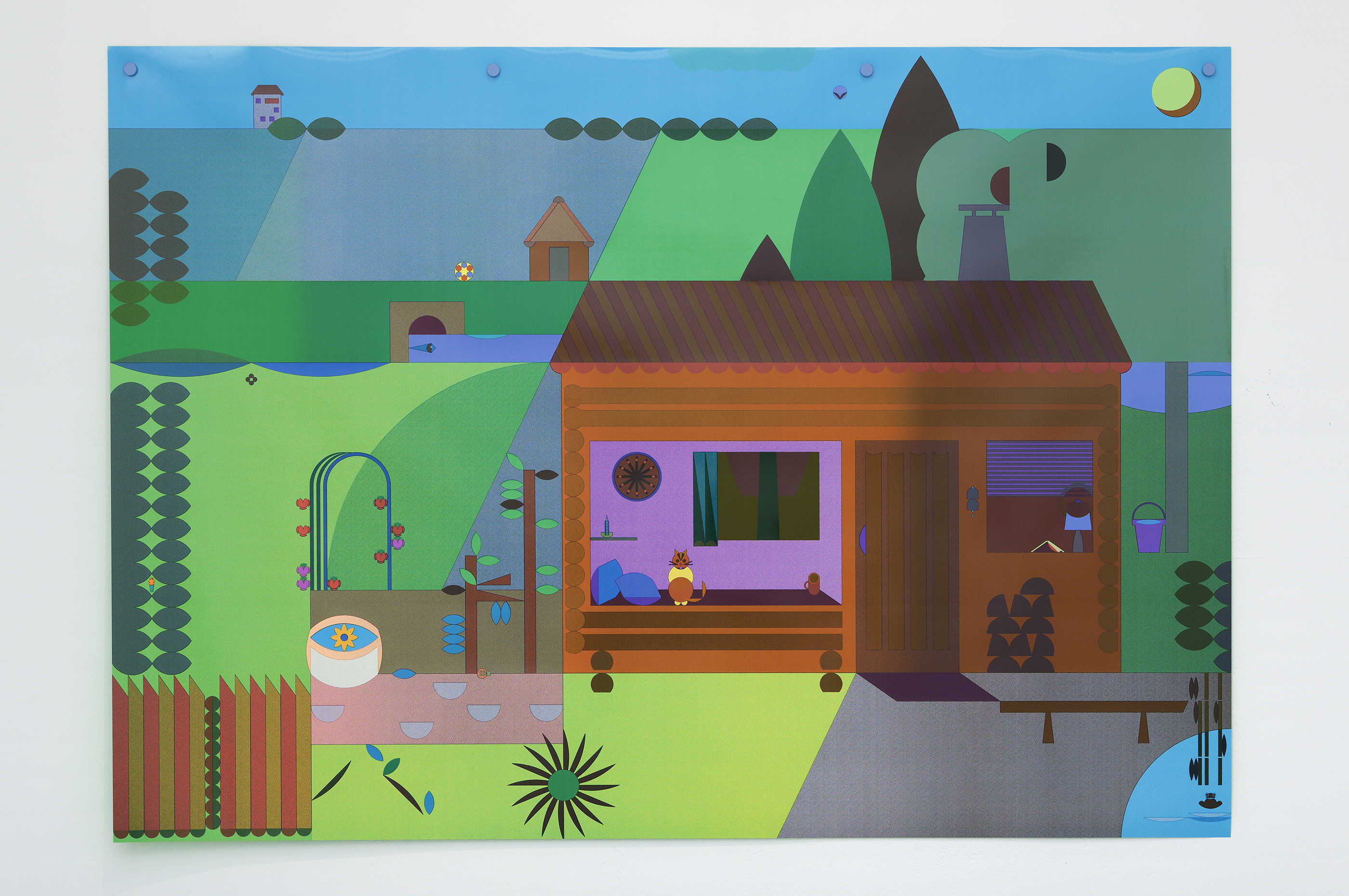 The exhibition at the Passerelle Centre for Contemporary Art, when the book and animated cartoon Panorama were presented, was an opportunity to adapt design to large-format screen printing. Here the magic of successive colour changes is conveyed, plunging the landscape into night and marking the passage of time. The little house, represented in the exhibition as a set, allows visitors to become part of the work, taking the colouring books published for the occasion so as to add their own touch of colour to the Panorama.