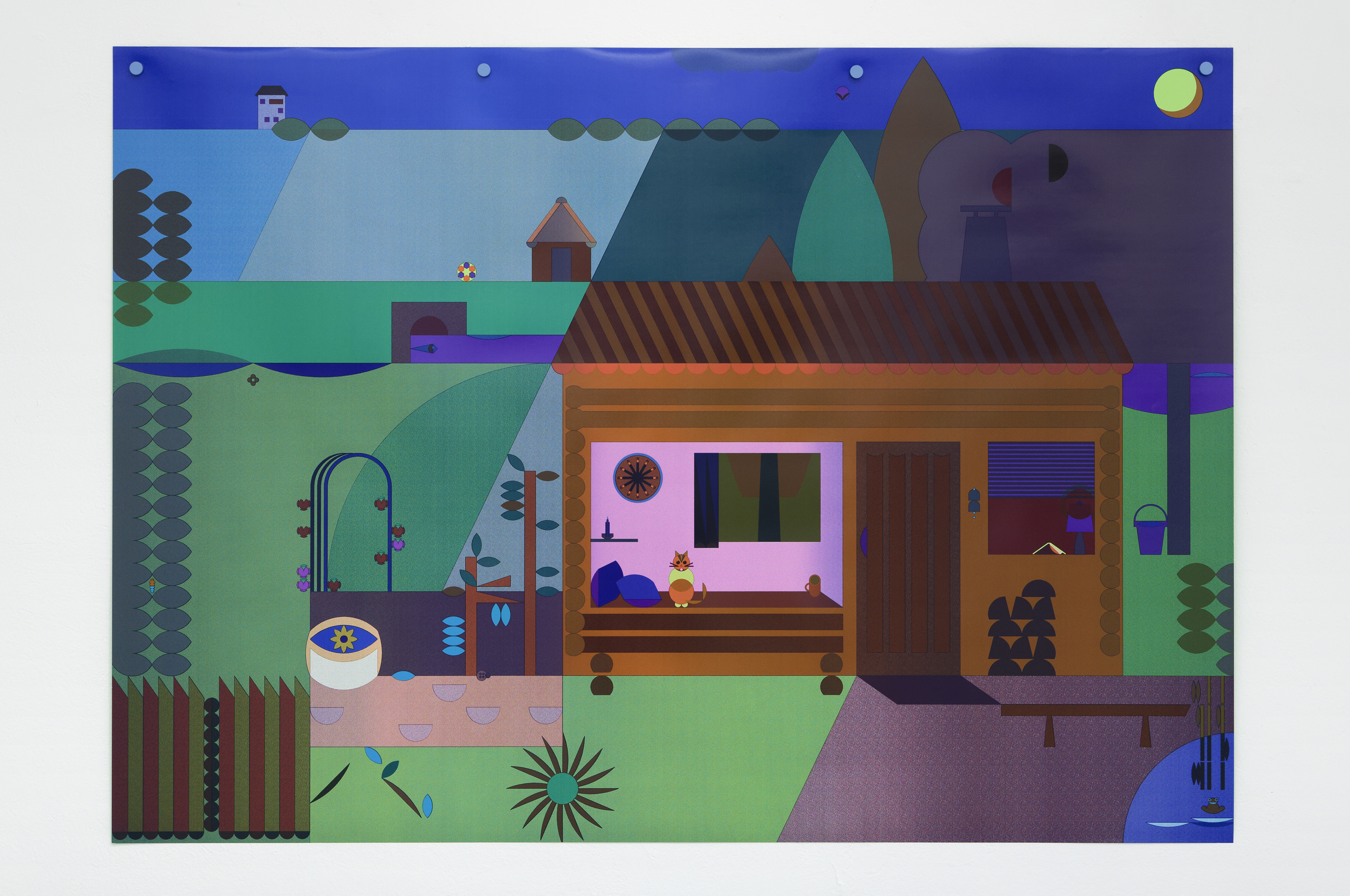 L’exposition à Passerelle Centre d’art contemporain, qui présente le livre et le dessin animé Panorama, a été l’occasion d’adapter le dessin pour une impression grand format en sérigraphie. Ici, c’est la magie des dégradés de couleurs successifs qui plonge le paysage dans la nuit et imprime le passage du temps. Le chalet, matérialisé dans l’exposition comme un décor, permet aux visiteurs de pénétrer dans l’ouvrage et de se saisir des cahiers de coloriages édités pour l’occasion, afin d’apporter leur touche de couleur personnelle au Panorama.