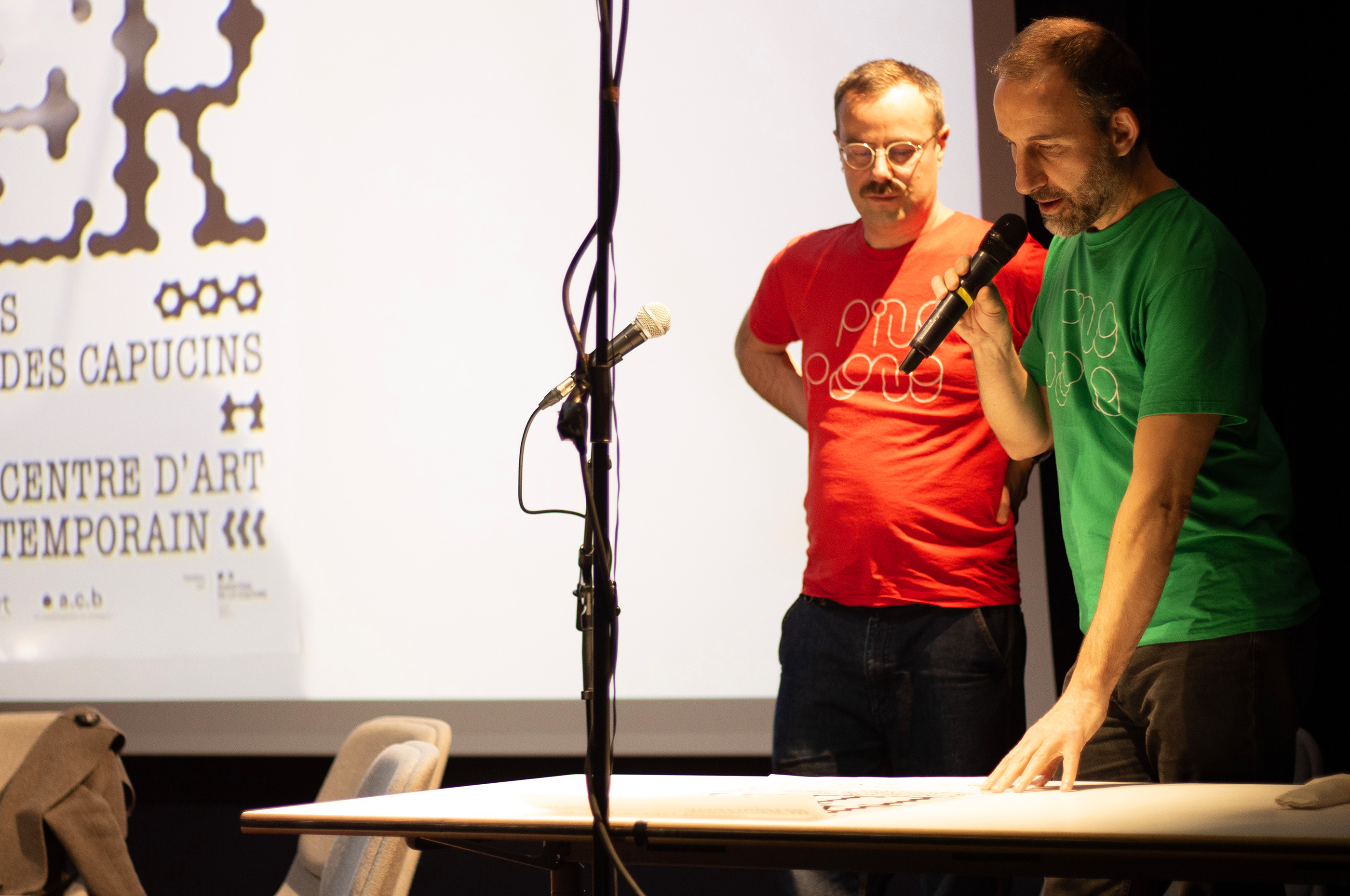 Alexandre Chaize (fondateur des Éditions du livre) et Bastien Contraire (auteur) ont pour coutume de s’adonner à un petit jeu de ping-pong éditorial. Celui-ci consiste à répondre à l’évocation d’un livre (via une double-page), par un autre ouvrage, et vice-versa. Ces aller-retours convoquent couleurs, sujets, mises en pages et formats, tous azimuts. À l’occasion de la séance organisée lors la journée d’étude Relier à Brest, j’ai rebondi par la création d’un logo!