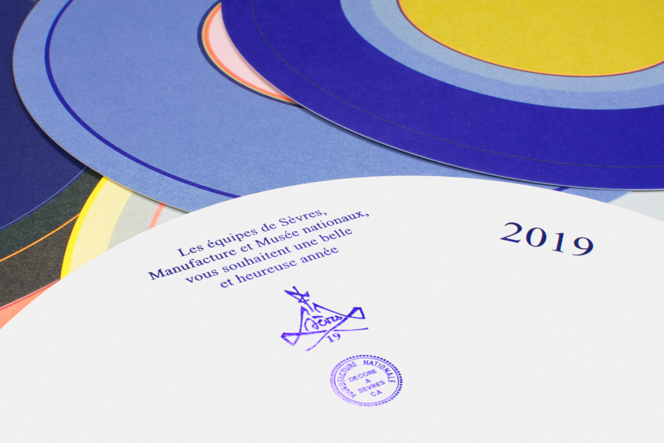 A set of plates and backing in cardboard, bearing the famous Trademark and Signature on the underside as is required. The format, colours and typography, symbolising the craftsmanship of the Manufacture de Sèvres are used here in the creation of this atypical printed object, sent as a New Year greetings card.