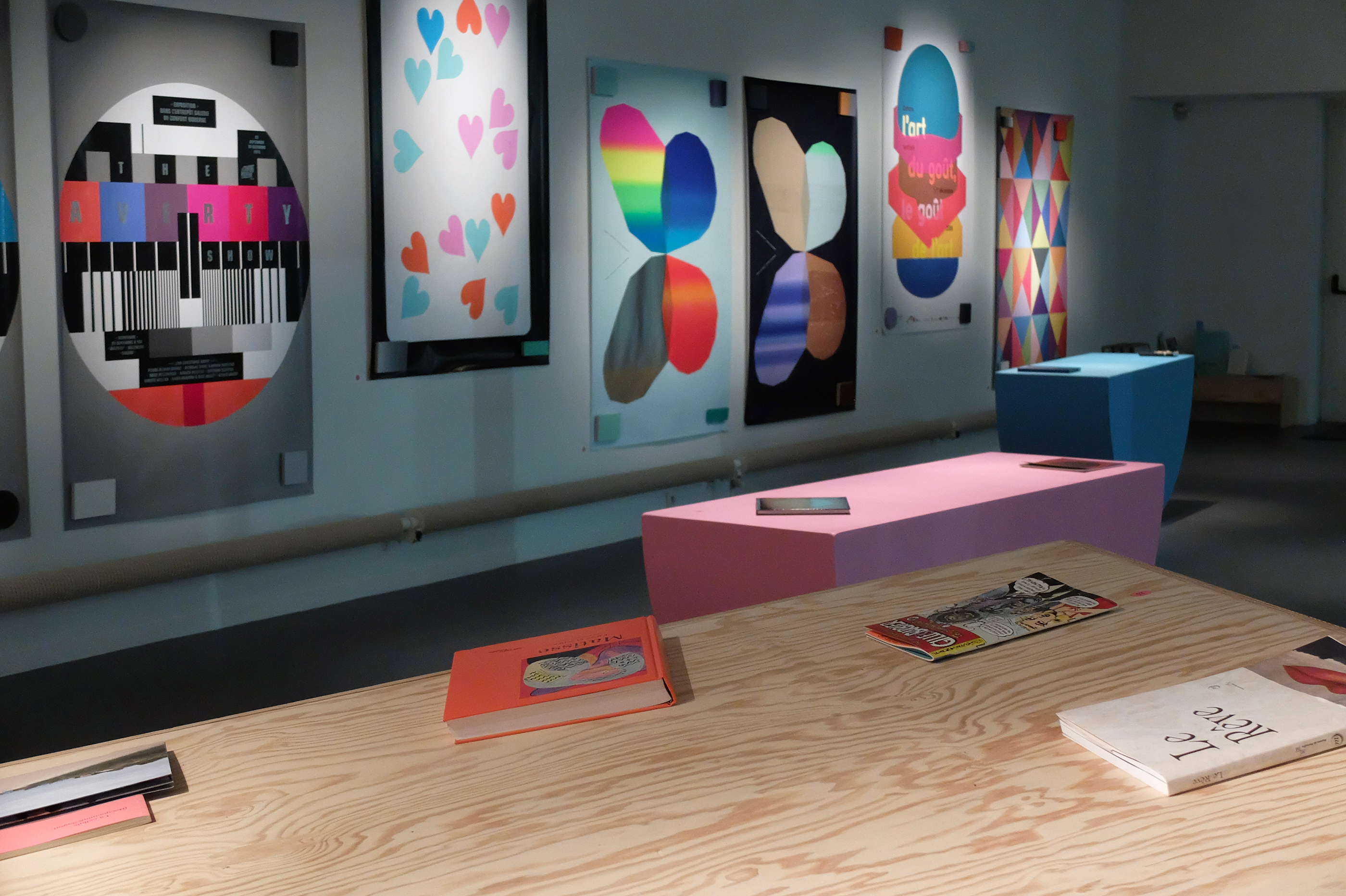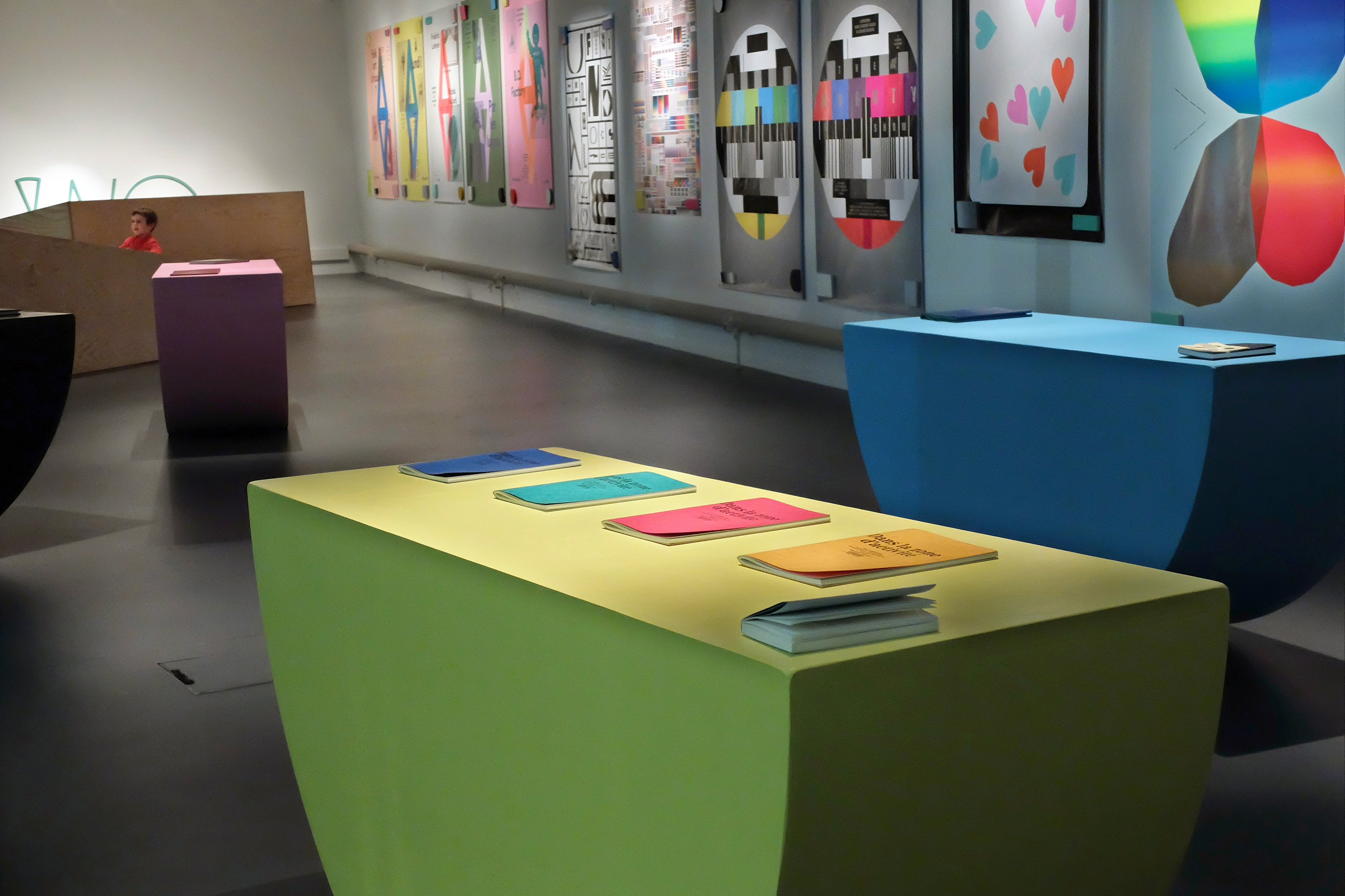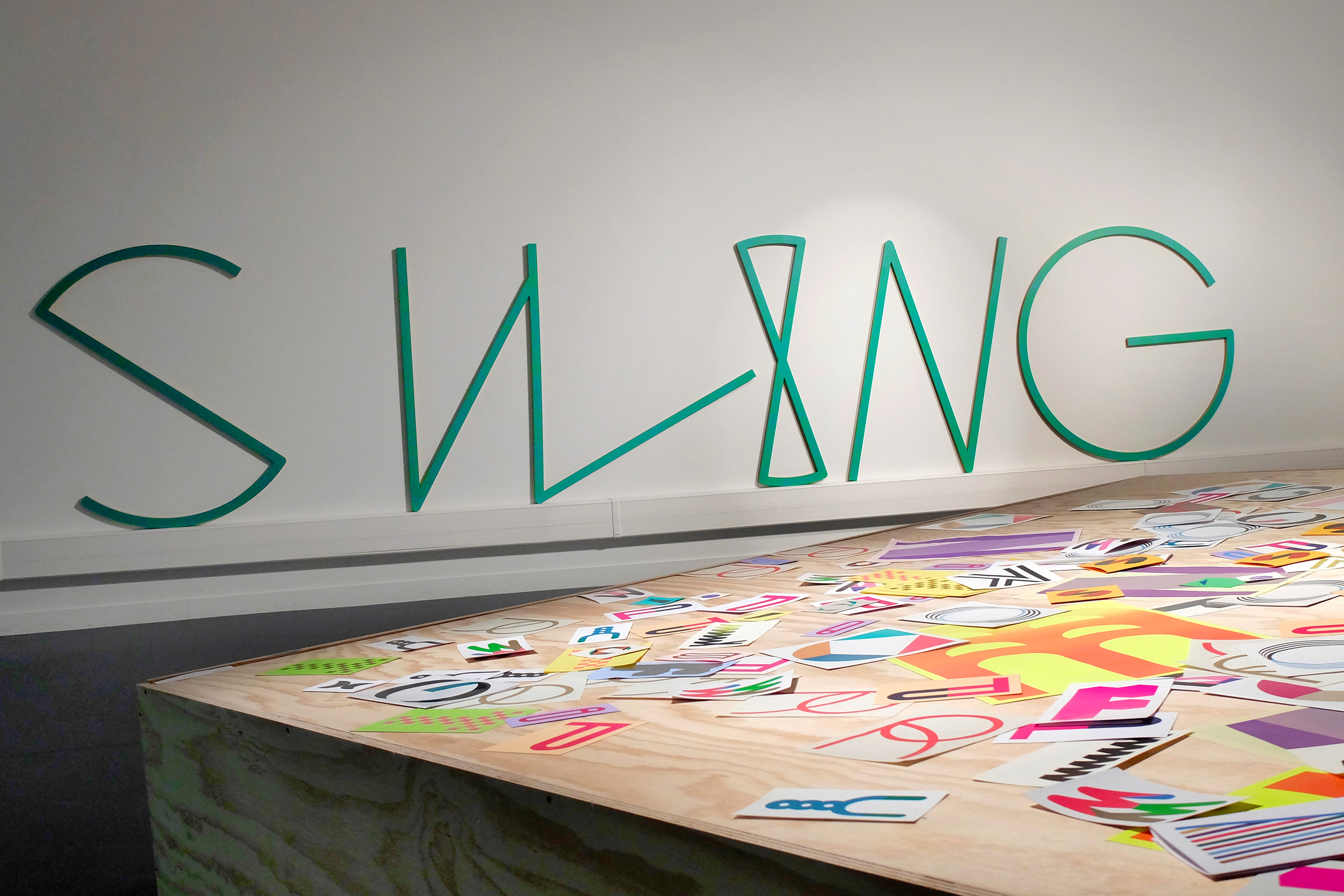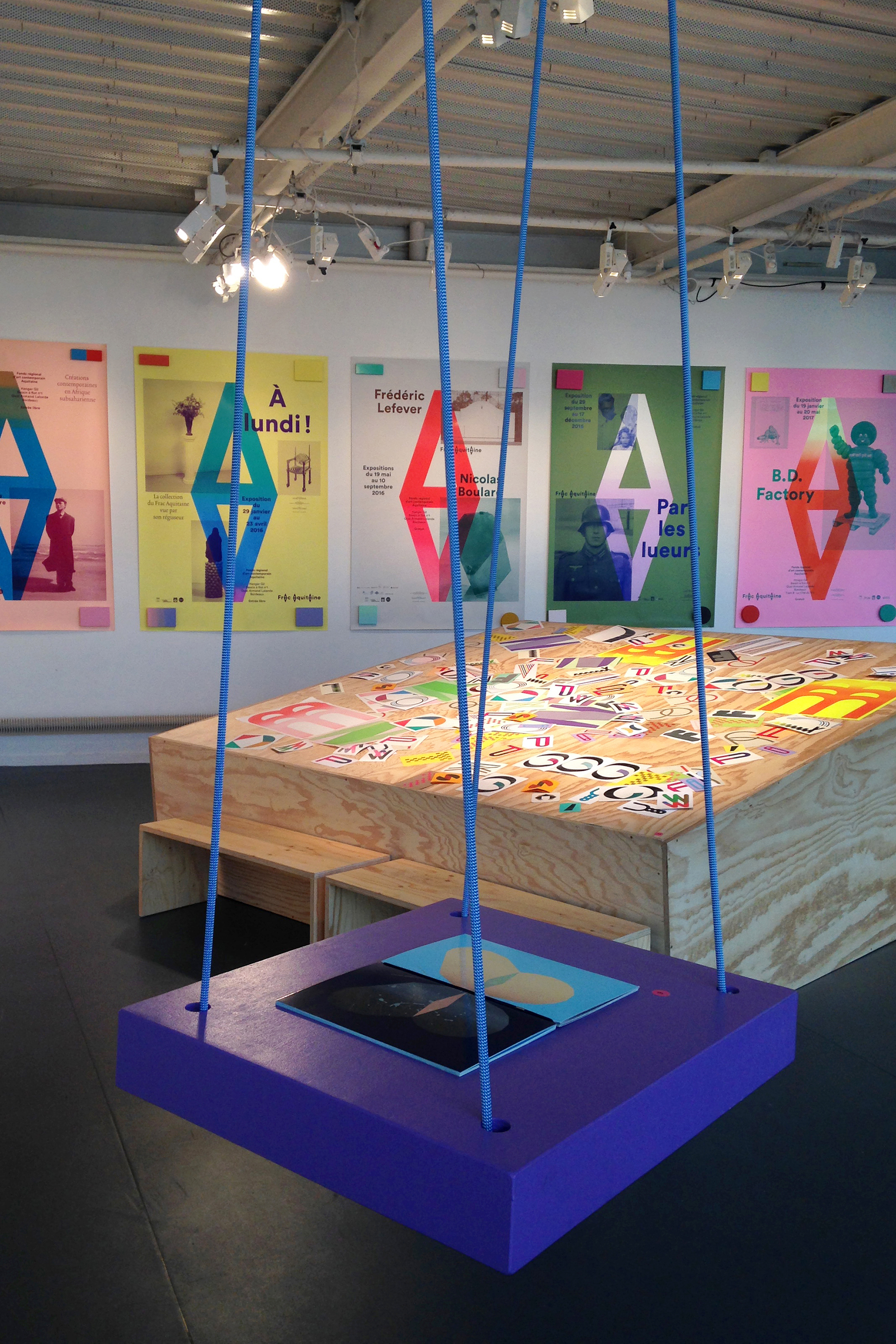 Ma première exposition rétrospective, qui s’est tenue à la Bibliothèque Hermeland à Saint-Herblain, a été une nouvelle occasion de collaborer avec la designer Pernelle pour la scénographie. Intitulée Swing, cette exposition m’a permis d’investir l’espace autour du mouvement et du rythme, en écho au travail de composition. Les projets s’enchaînent, se chevauchent et se répondent, dans un joyeux mouvement. Les magnets géants placés sur le grand mur d’affichage composaient une partition autonome. La table balançoire, ainsi que les modules-culbuto, produisaient un inévitable balancement au fil de la consultation des ouvrages. Les lettres SWING étaient matérialisées à l’entrée de l’exposition et pouvaient être pilotées (à loisir!) par les visiteurs…