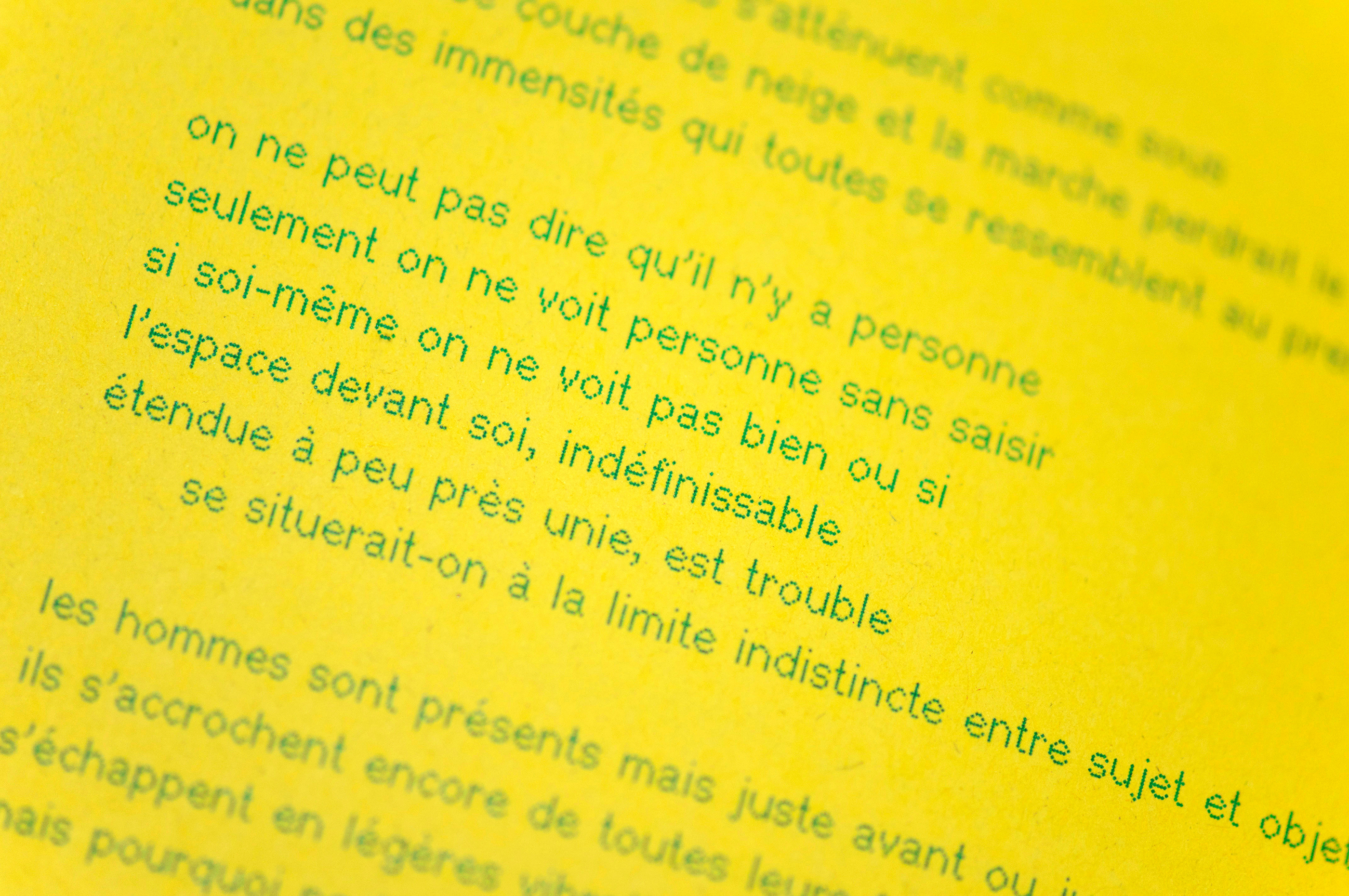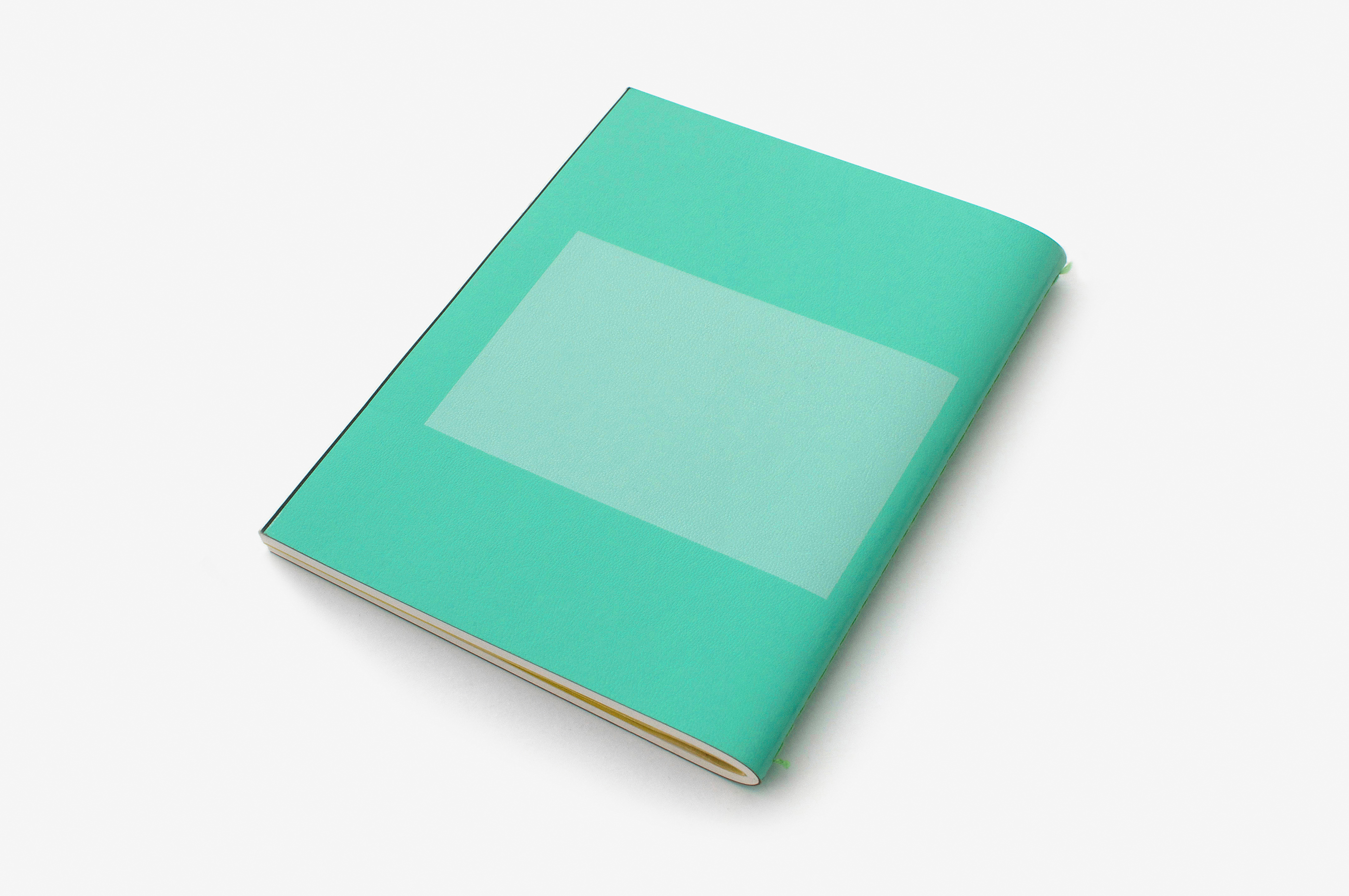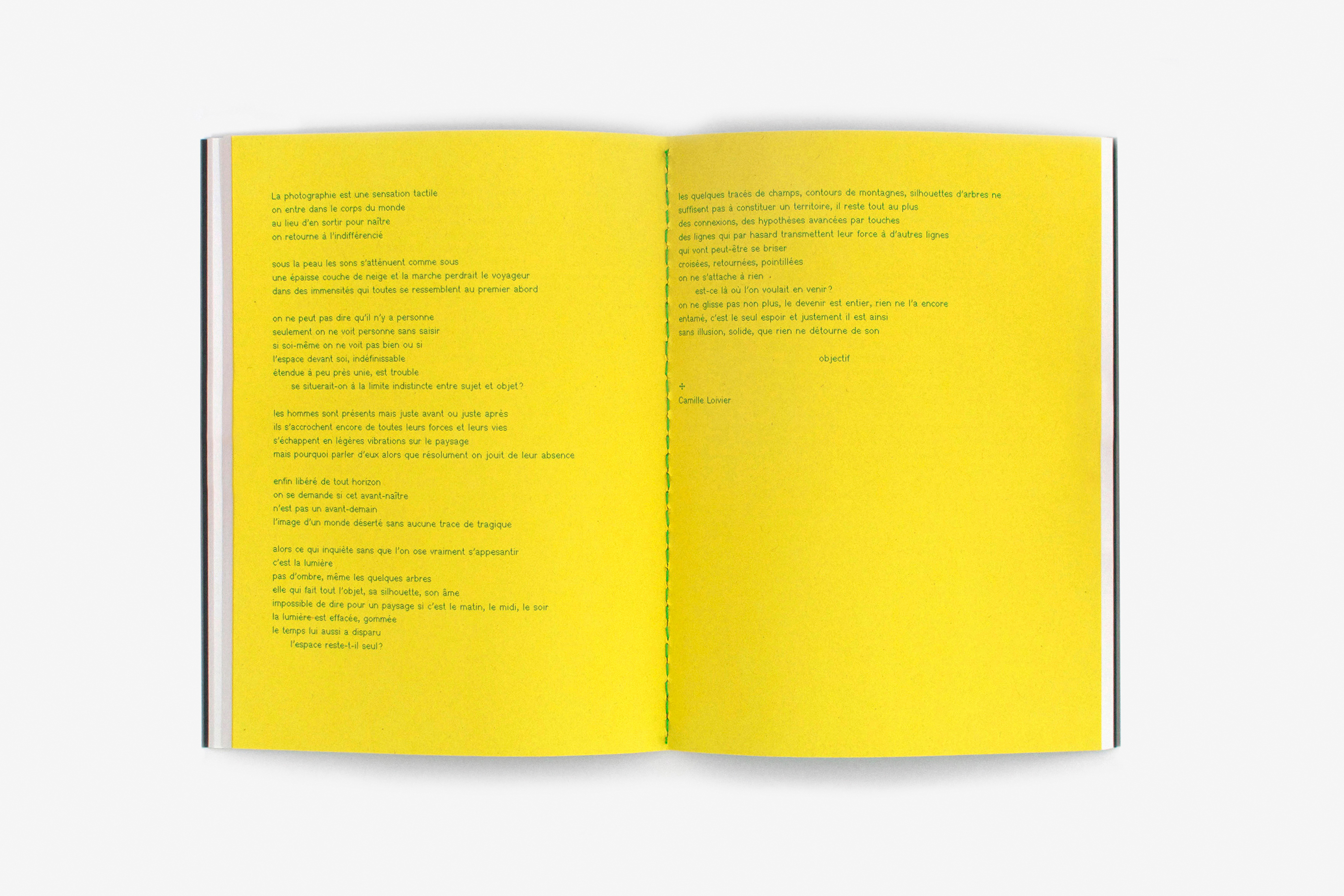 This book by Ariadne Breton-Hourcq shows three series of photographs of slightly out-of-focus Chinese landscapes with very subtle contrasts. The repeating layout of the pages points up the delicate variations between the images and, as when looking out of a moving train, creates a “hypnotic” feeling. This small book, very different from the usual appearance of books on photography, can be compared to a “notebook”. The photographs are contained within a “silent” cover, screen-printed onto which in transparent white is a shape resembling the arrangement of the photographs inside the book. The text appears in a coloured inner notebook. The typeface, composed of very small geometric forms, emits a vibration and demands the same concentration from the reader as do the images. Variations of green run through the book: the blueish-green of the cover, an almost black green for the flyleaves, a bright yellow that makes the blue typeface appear green for the central pages and, finally, bright green thread to stich the binding.