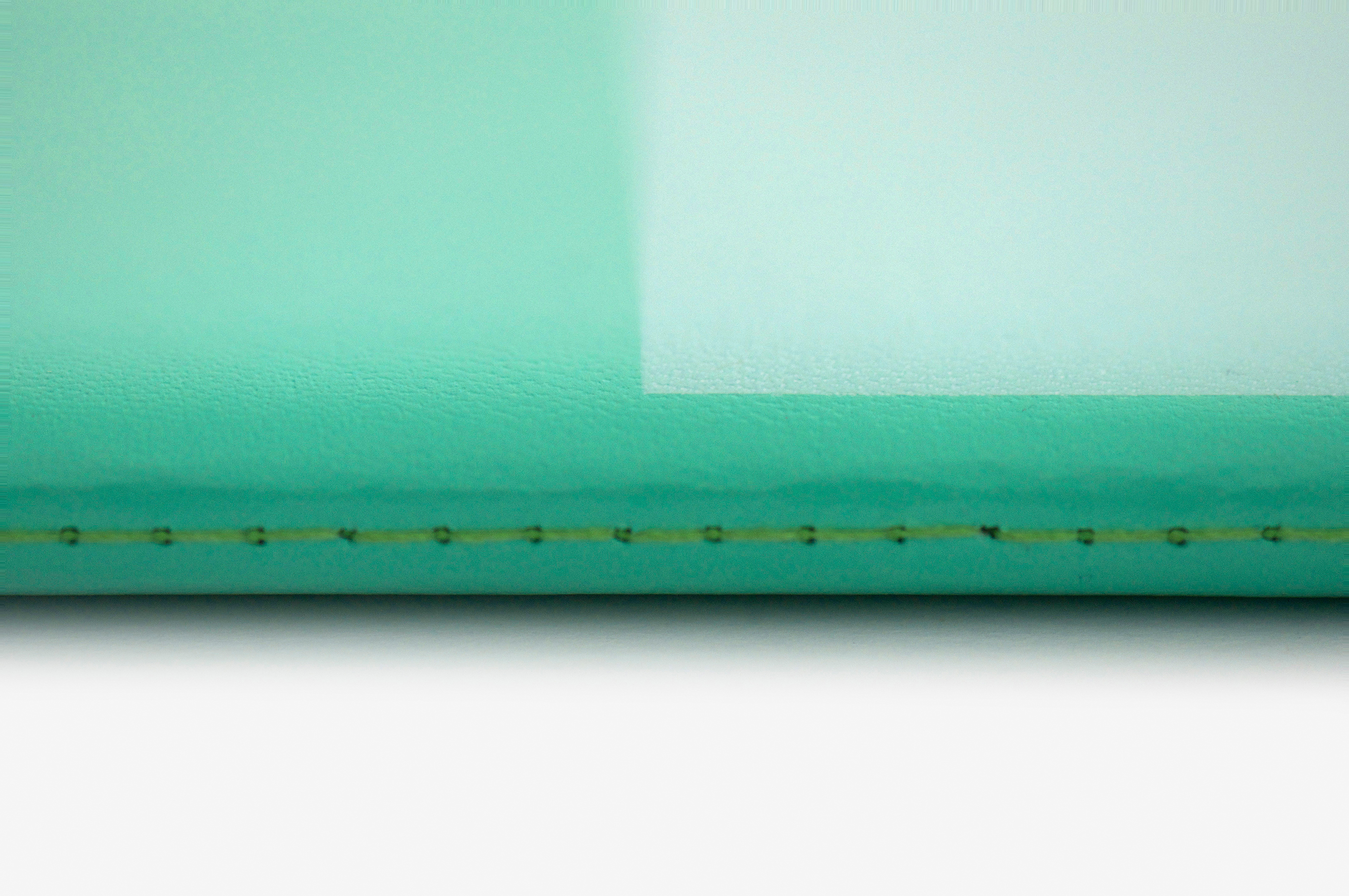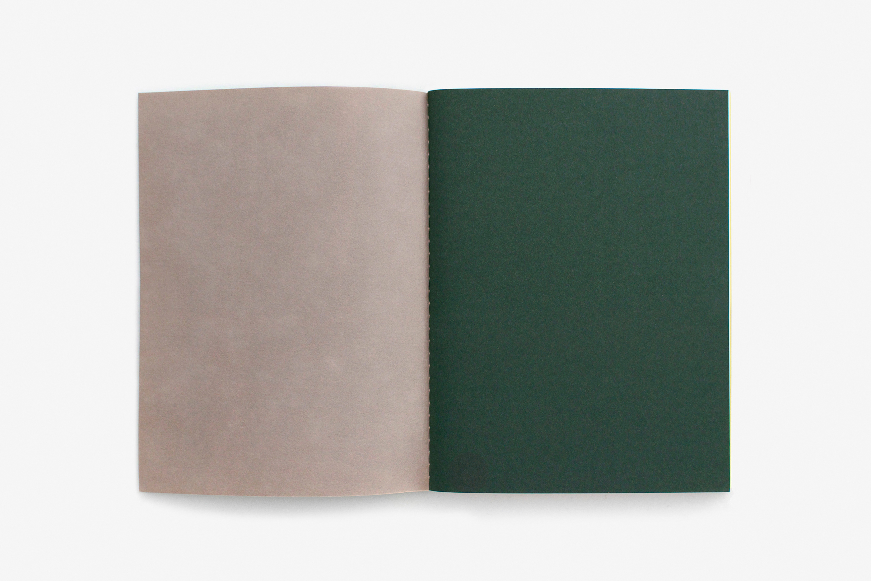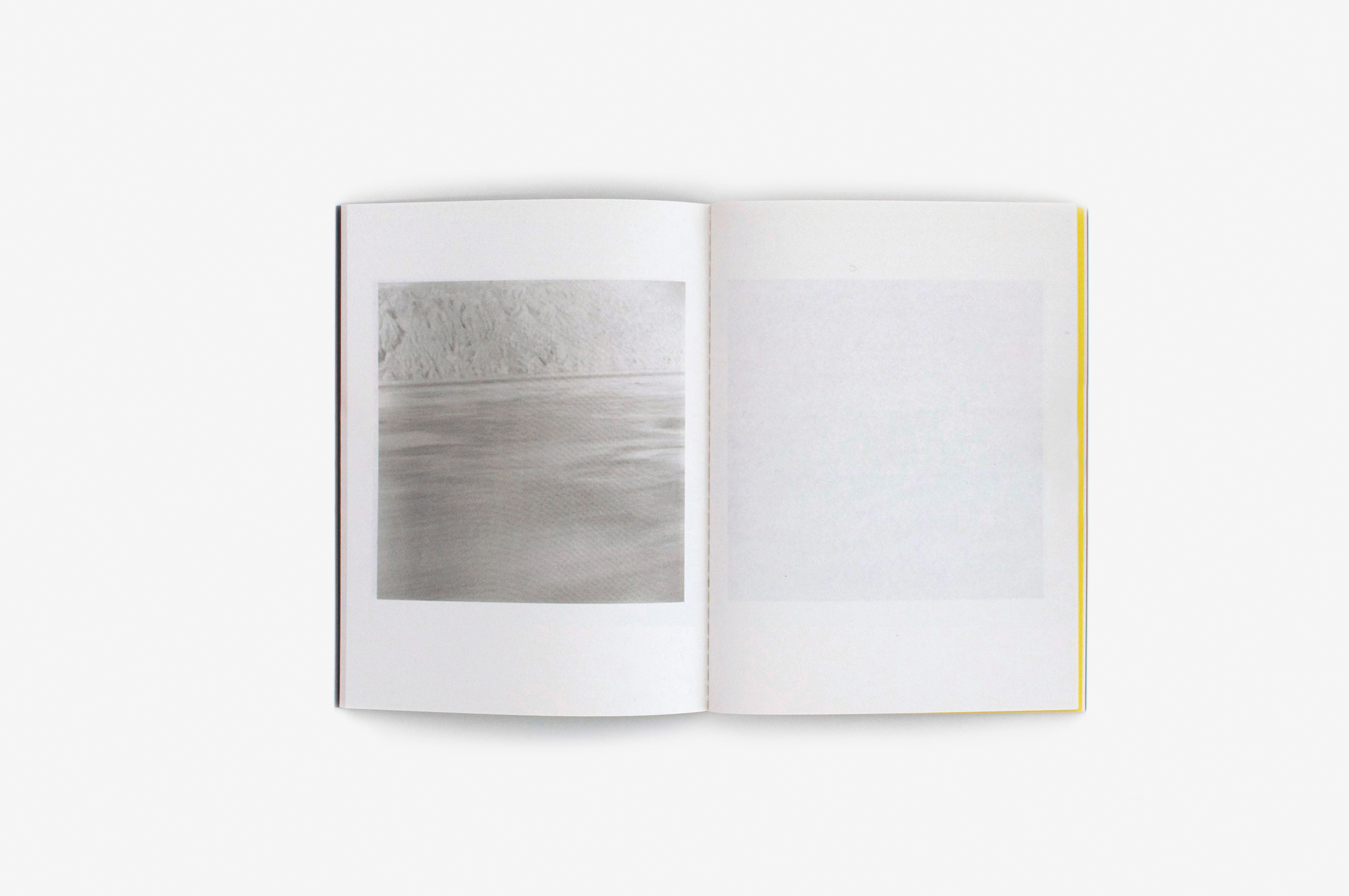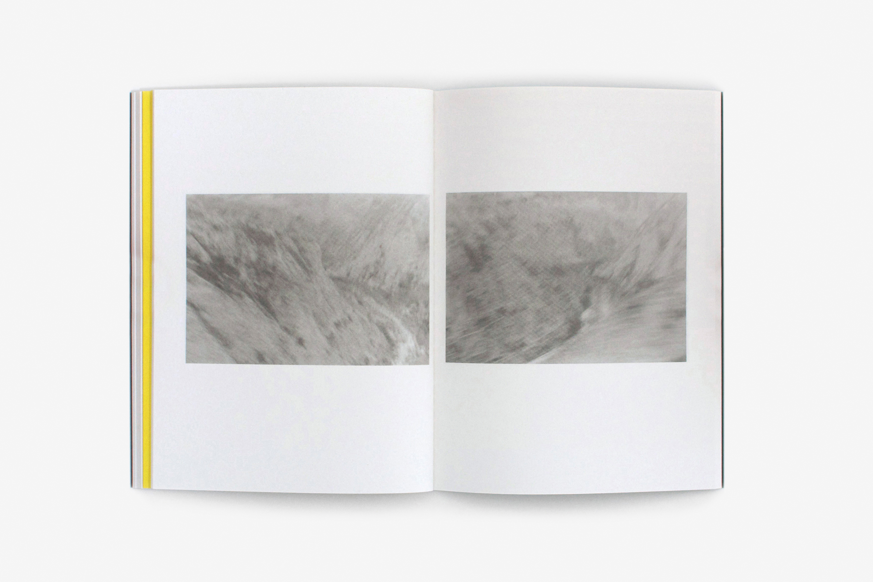 This book by Ariadne Breton-Hourcq shows three series of photographs of slightly out-of-focus Chinese landscapes with very subtle contrasts. The repeating layout of the pages points up the delicate variations between the images and, as when looking out of a moving train, creates a “hypnotic” feeling. This small book, very different from the usual appearance of books on photography, can be compared to a “notebook”. The photographs are contained within a “silent” cover, screen-printed onto which in transparent white is a shape resembling the arrangement of the photographs inside the book. The text appears in a coloured inner notebook. The typeface, composed of very small geometric forms, emits a vibration and demands the same concentration from the reader as do the images. Variations of green run through the book: the blueish-green of the cover, an almost black green for the flyleaves, a bright yellow that makes the blue typeface appear green for the central pages and, finally, bright green thread to stich the binding.