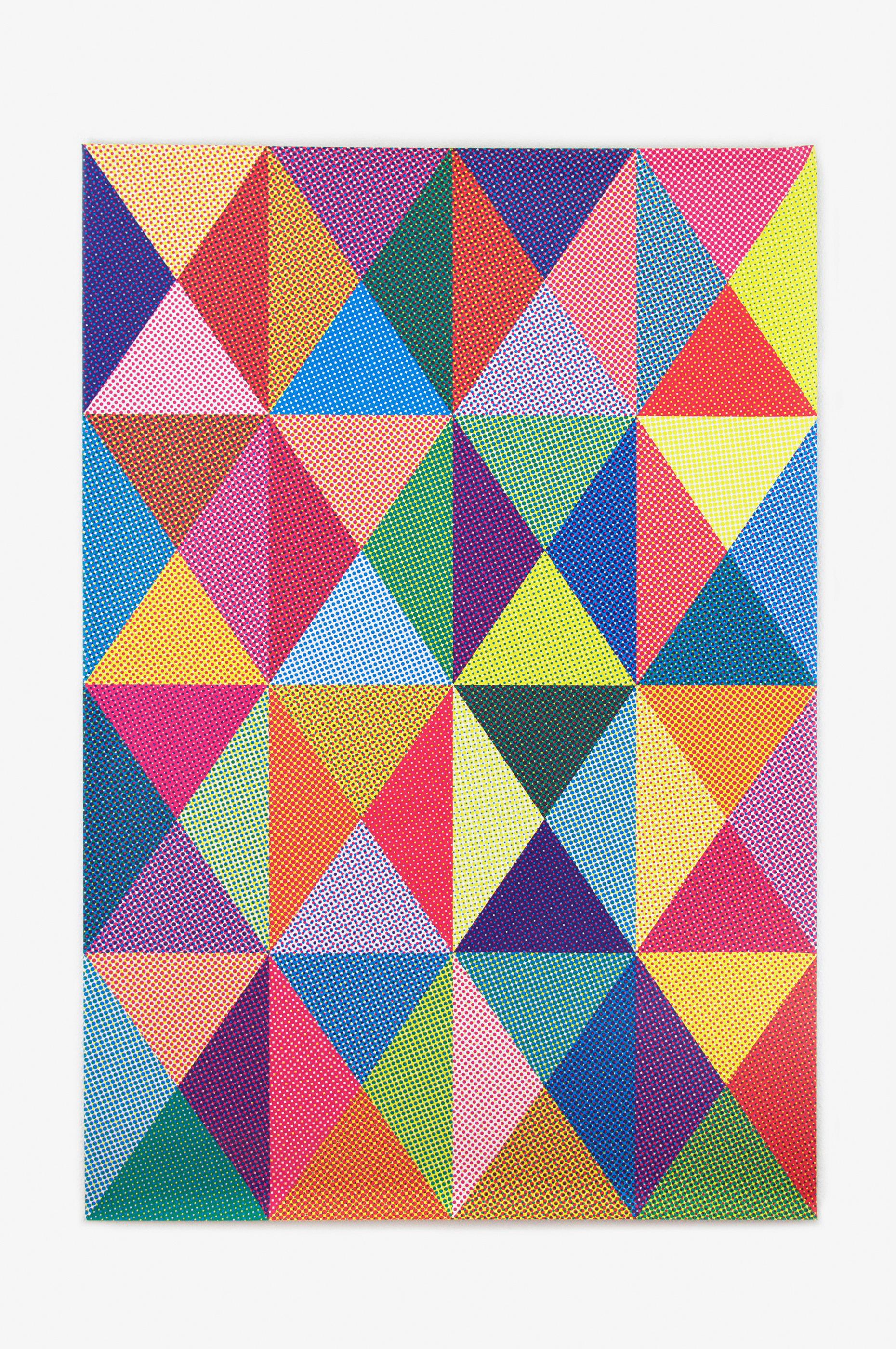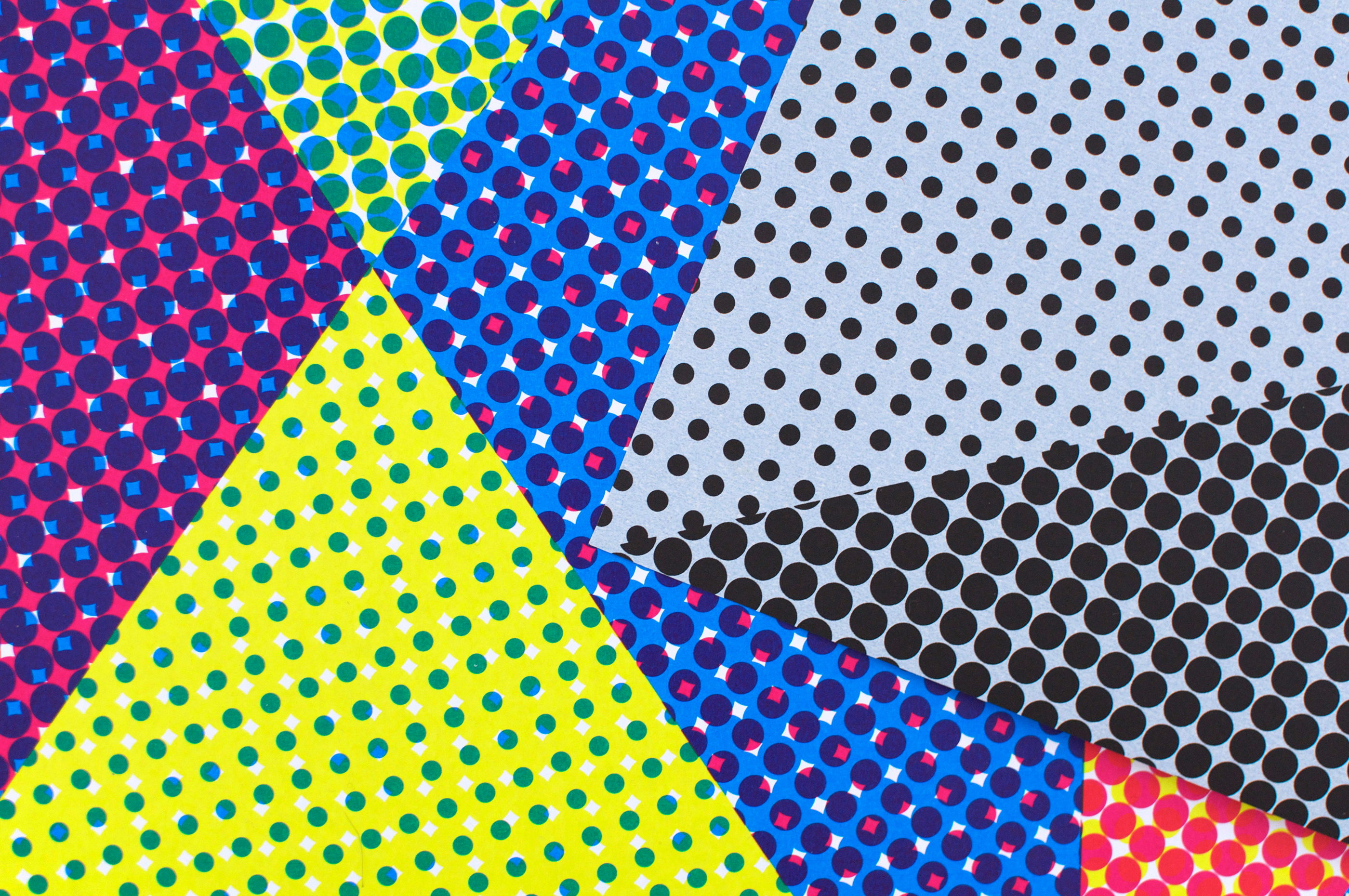 Avec Tramatic, je réactive le projet Multipli. Si le principe du pliage des affiches pour révéler les lettres reste le même, la plasticité est très différente. La structure est ici marquée par des champs géométriques, colorés au recto et noirs au verso. Les lettres sont imprimées en sérigraphie dans une trame maximale. Il en résulte une démesure qui joue avec la lecture des formes et des couleurs, un clin d’œil à la grosse trame d’impression des affiches publicitaires mainstream.