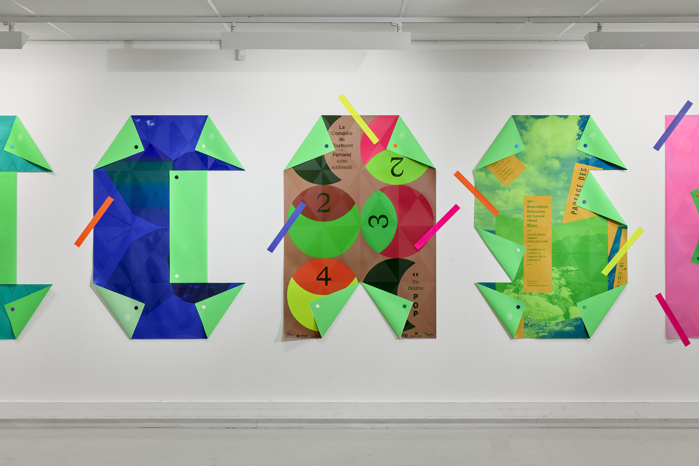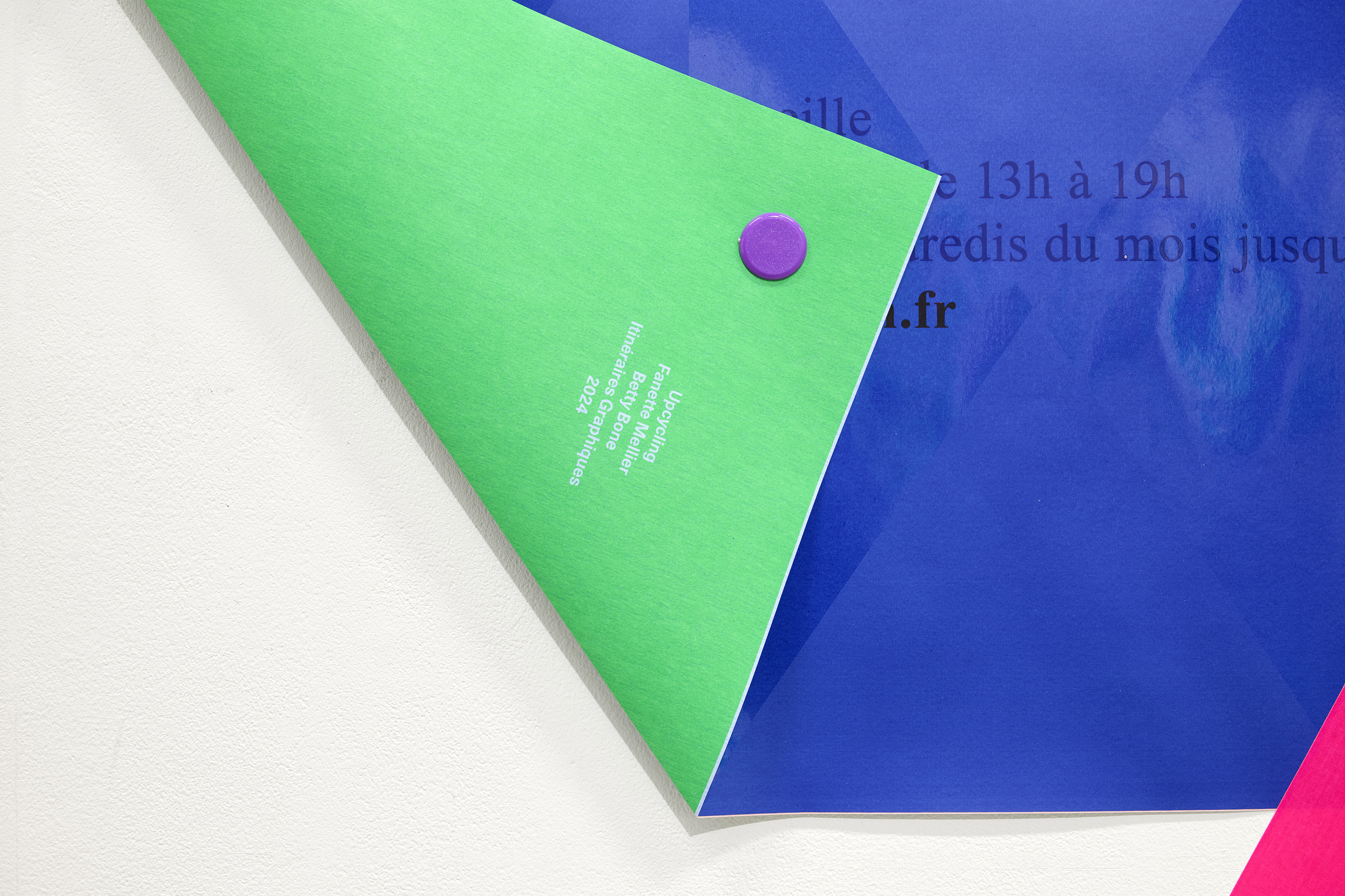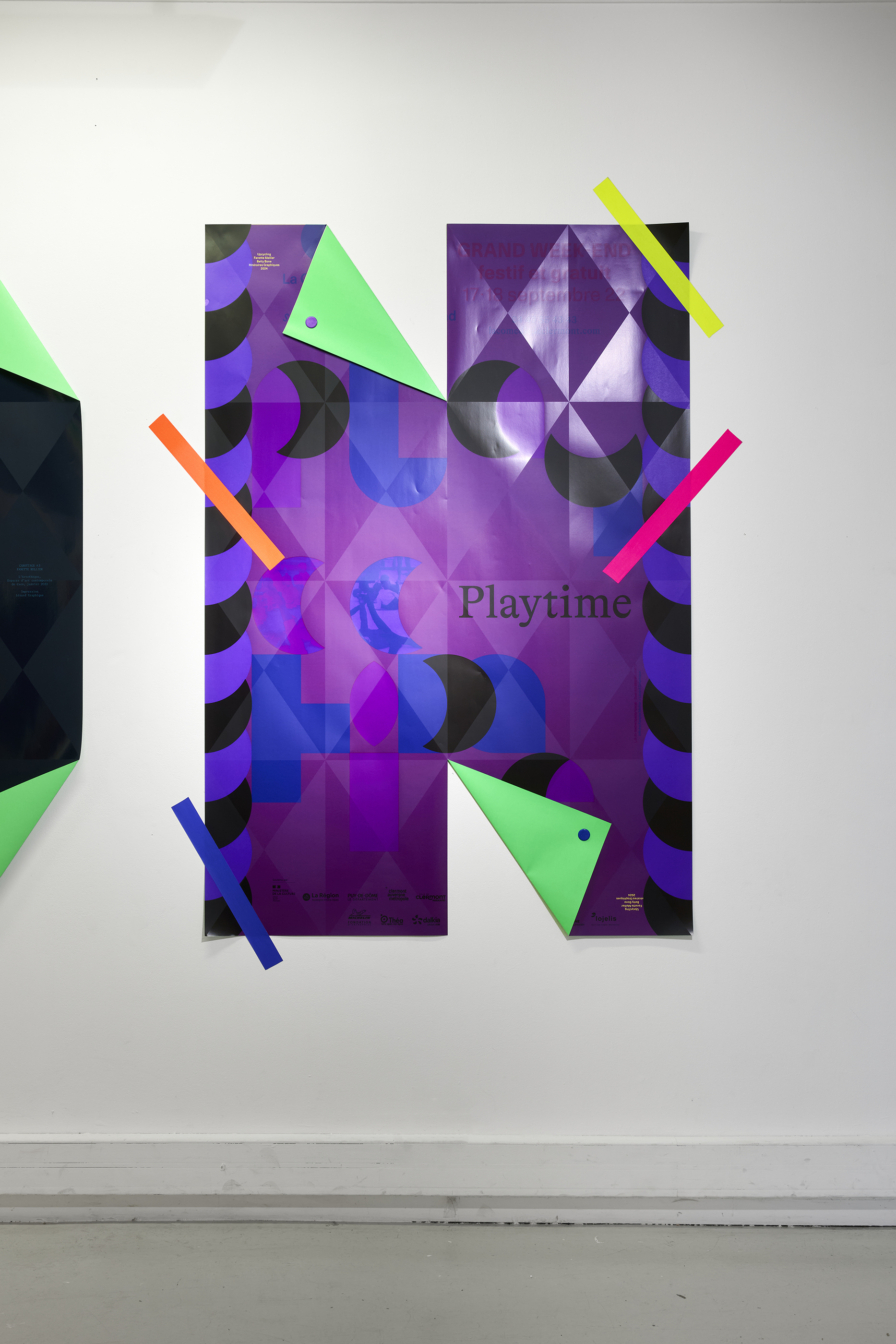 The Upcycling installation gave my posters a second life, transforming them into large letters. Around thirty Decaux-format posters, selected from my archives, were sent to Lézard graphique where they were reprinted. Covered with a flat colour and a varnish (with the Multipli grid, created in Nantes in 2010), they are transformed into letter matrices. Thanks to some magical folding, a sentence (written by Betty Bone) emerges: “See double on occasion”. This Upcycling transforms the printed material and gives it new life, as well as allowing me to re-visit my graphic work.