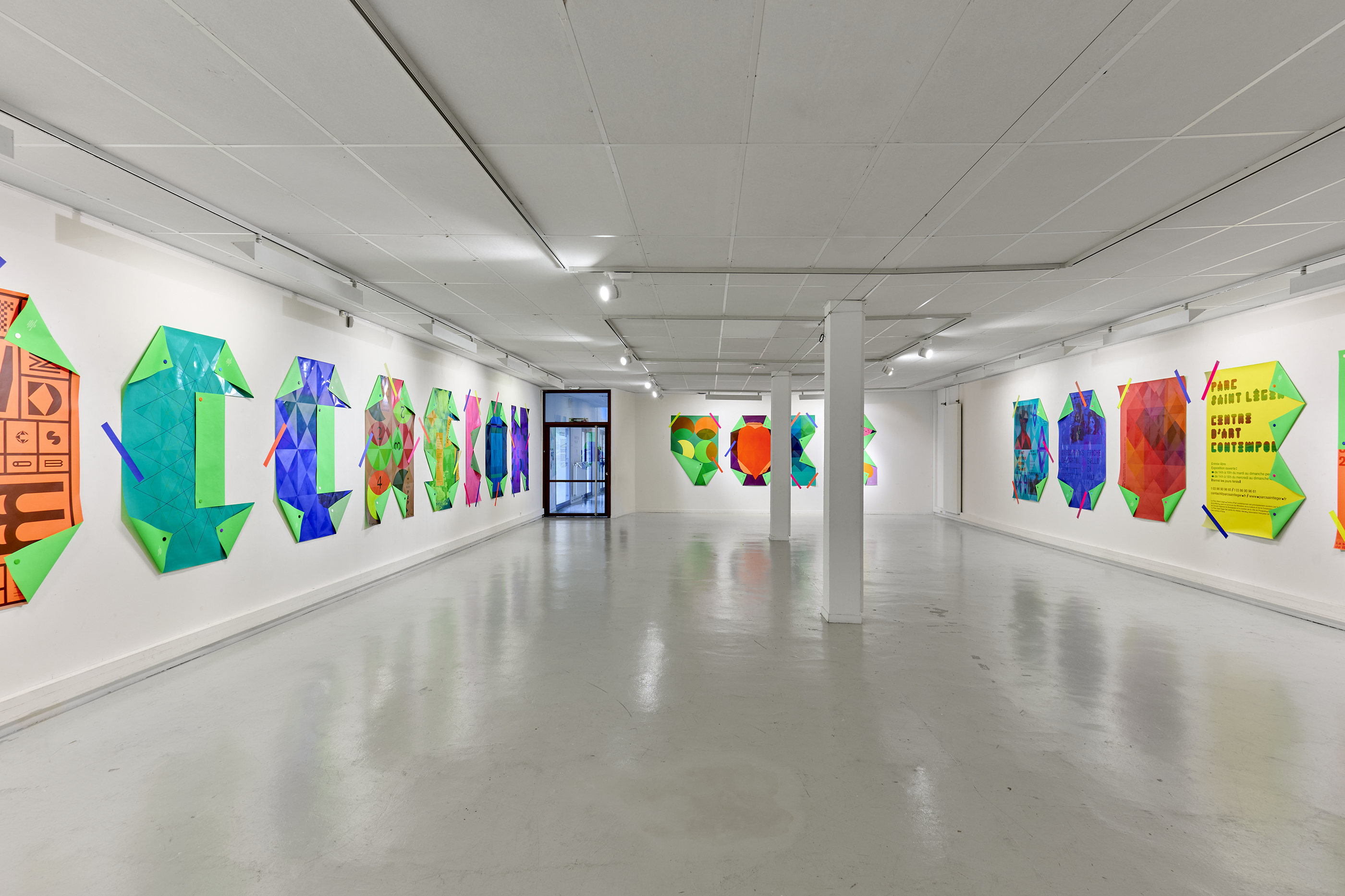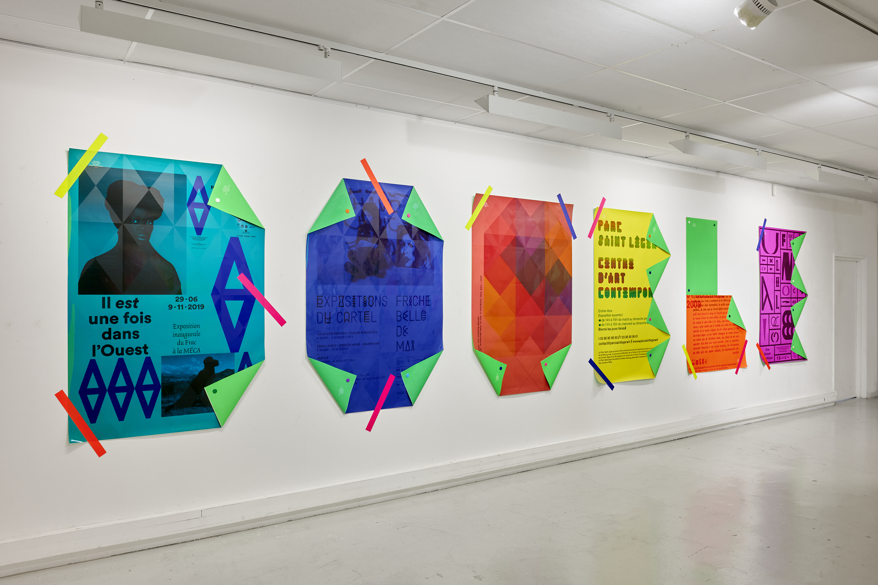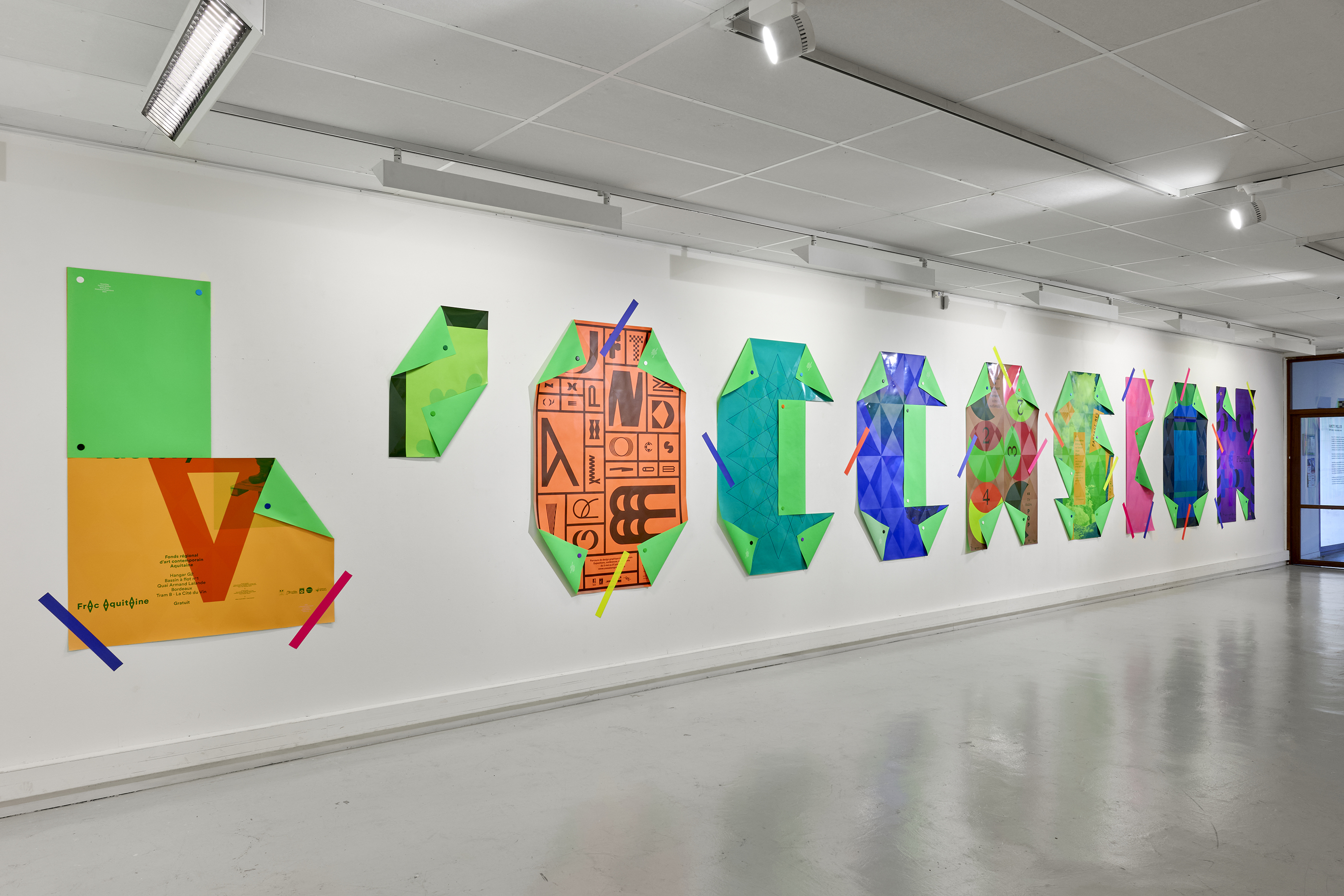 The Upcycling installation gave my posters a second life, transforming them into large letters. Around thirty Decaux-format posters, selected from my archives, were sent to Lézard graphique where they were reprinted. Covered with a flat colour and a varnish (with the Multipli grid, created in Nantes in 2010), they are transformed into letter matrices. Thanks to some magical folding, a sentence (written by Betty Bone) emerges: “See double on occasion”. This Upcycling transforms the printed material and gives it new life, as well as allowing me to re-visit my graphic work.