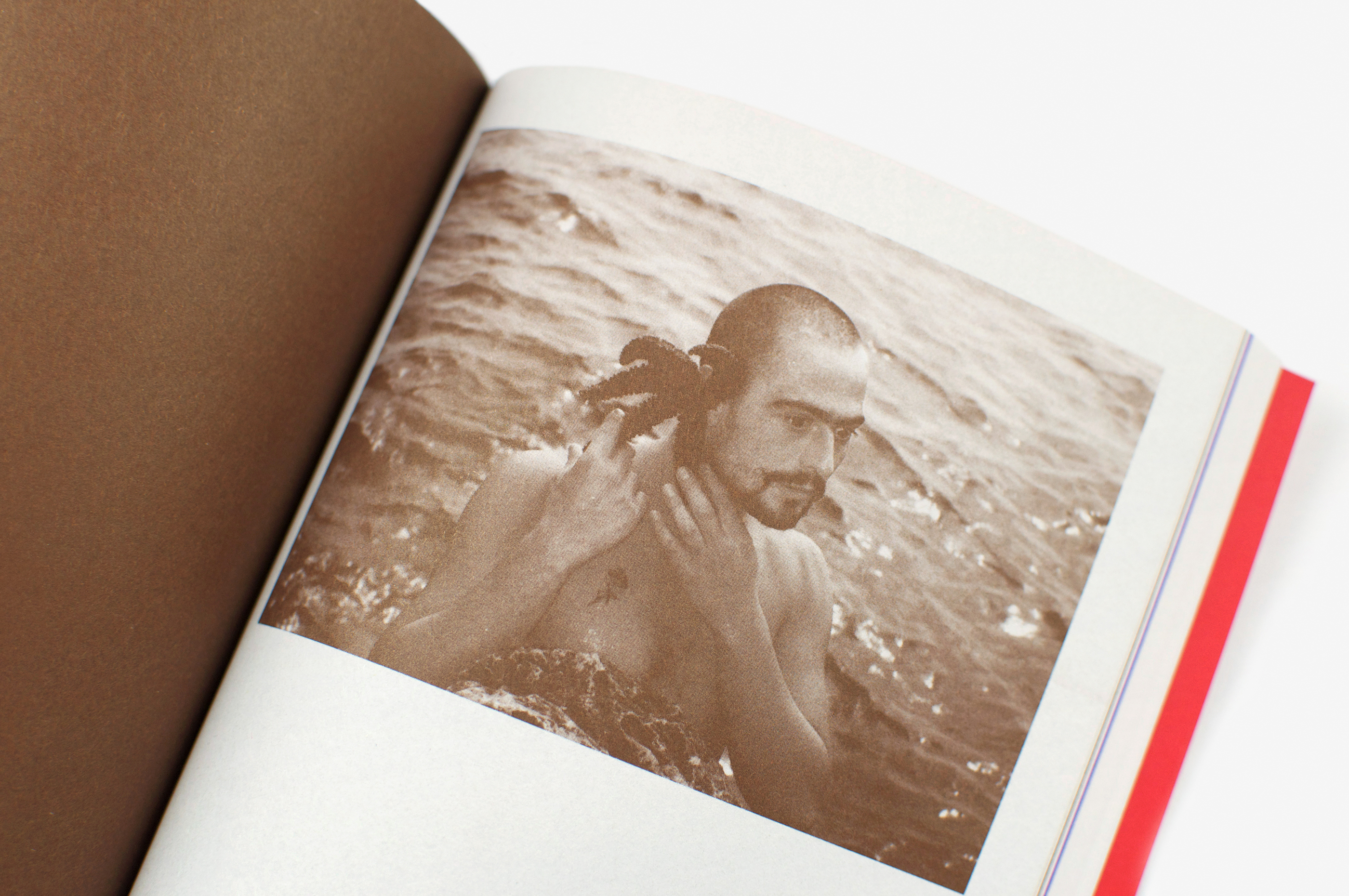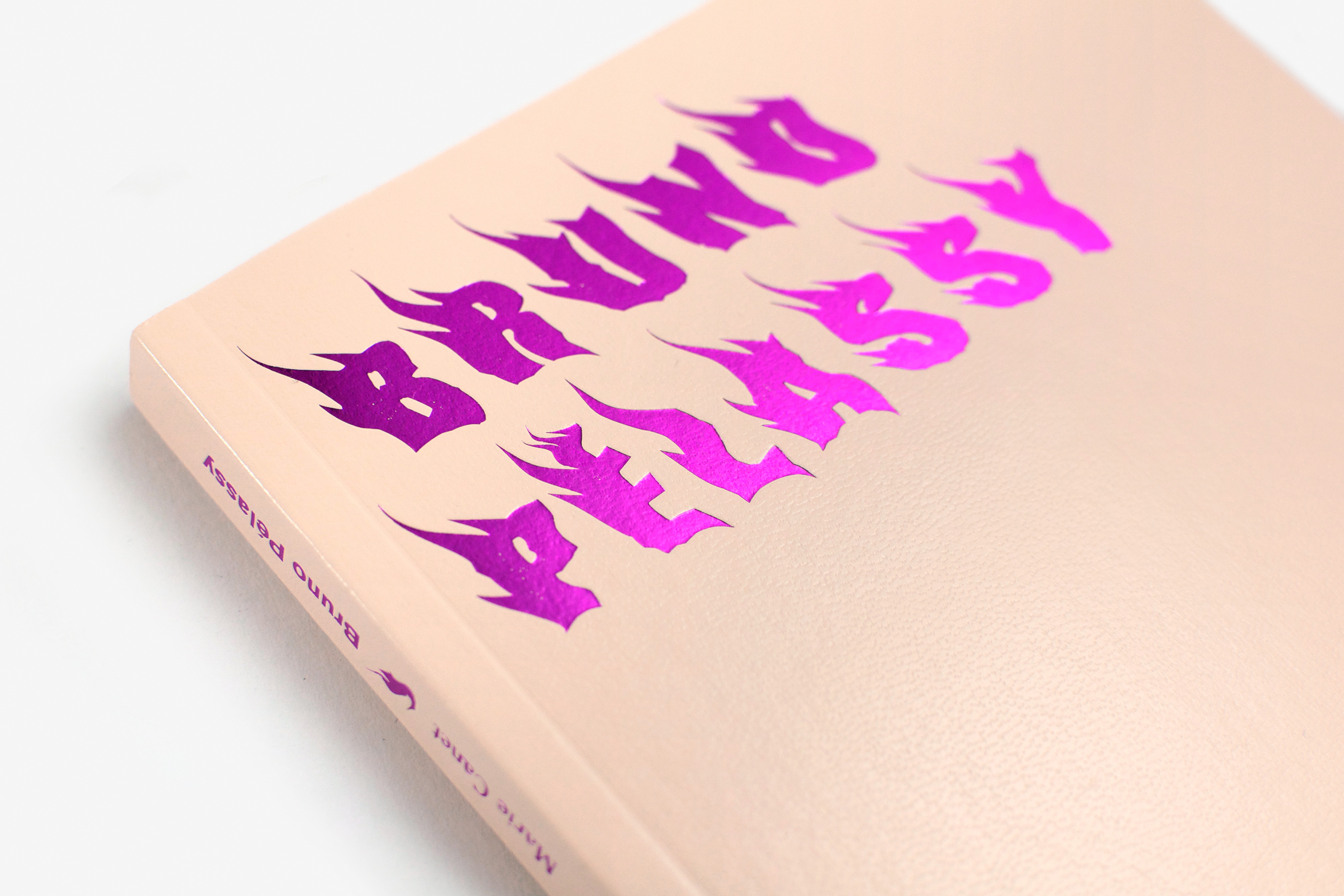 Ce livre sur l’artiste Bruno Pélassy, mort du Sida en 2002, est construit autour d’un texte de Marie Canet, mettant en lumière le lien entre son œuvre et la maladie. Dans sa souplesse comme dans son format et son articulation, le livre a été dessiné pour être lu. Le similicuir couleur chair de la couverture (contrecollé sur papier rouge), accueille le nom de l’artiste, doré à chaud et auréolé de flammèches. Le cahier image qui entame le livre, traverse de façon fulgurante, en 16 pages, la délicatesse de l’œuvre de Bruno Pélassy. Le texte, mis en page comme un roman (mais imprimé en couleur) prend le relais. Sur chaque page de droite est incrustée en vignette une capture d’écran du film Sans titre, sang titre, cent titres, œuvre manifeste de l’artiste, vouée à disparaître car fragilisée à chaque projection du fait du support vidéo. Cette œuvre traverse le livre à la manière d’un flip book, ancrant dans la matière du livre la notion de temporalité qui consume l’œuvre de l’artiste.
