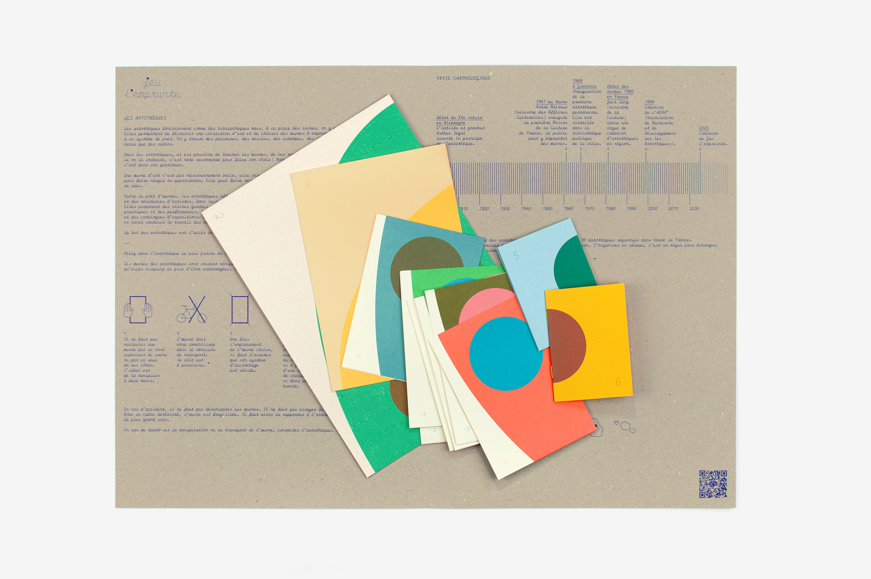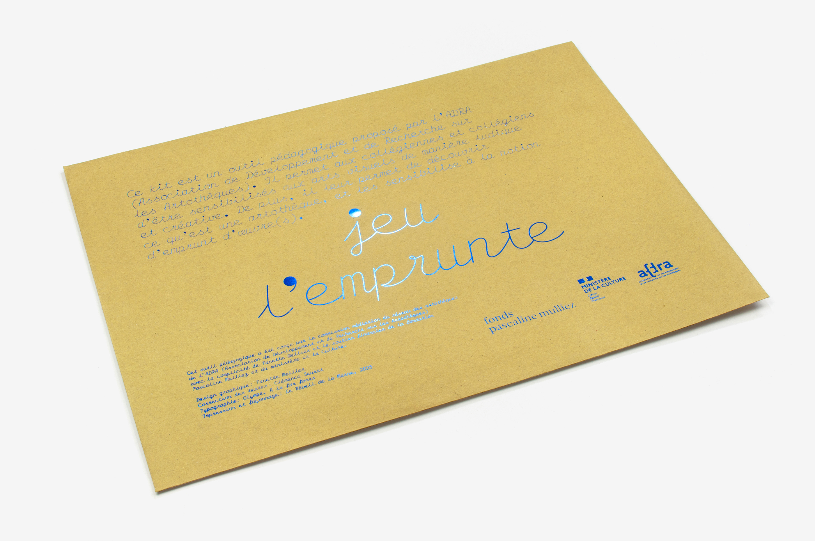 Jeu l’emprunte est un outil pédagogique proposé par l’Association pour le Développement et la Recherche sur les Artothèques. Il permet aux collégien·ne·s d’être sensibilisé·e·s aux arts visuels de manière ludique et de découvrir ce qu’est une artothèque. Cet outil est constitué de plusieurs supports complémentaires (présentation, règles du jeu, lexique, aide à la description, fiches mission, etc). Disposés à plat, ces supports complémentent un dispositif qui présente une œuvre sur un chevalet en bois, et recomposent l’image globale d’une palette de peinture. L’outil iconique de la palette devient, de façon métaphorique, un outil de compréhension des arts visuels. Chaque support, imprimé sur un papier spécifique (brut, coloré, iridescent…), et avec des couleurs variées, peut être disposé recto ou bien verso. Ainsi, l’image de la palette est à la fois composite et évolutive. La typographie Olympe, avec son dessin script et mécanique, permet de mimer avec fantaisie les documents vintage auto-édités par les professeurs.
