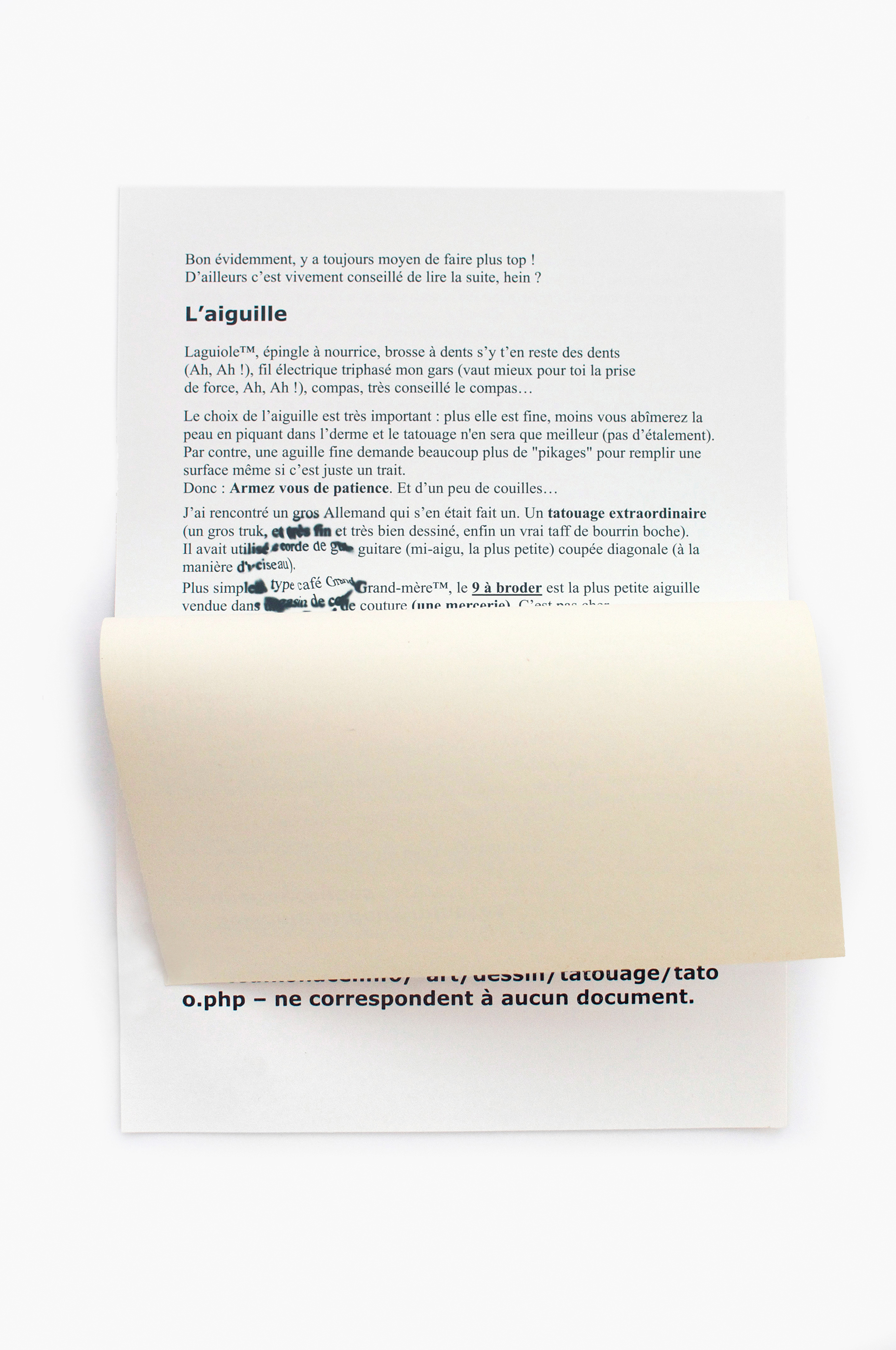 Ce texte de Manuel Joseph est un mode d’emploi, court et dense, indiquant comment se tatouer en prison avec les moyens du bord. La langue est directe et stratifiée, oscillant entre violence, cynisme et tendresse. Le texte est très concis, il n’y a pas matière à faire un livre au sens traditionnel. La mise en page du texte par l’auteur m’a semblé signifiante à l’état brut. L’esthétique par défaut de Word, efficace, dépouillée et pauvre constitue un bon point de départ pour la mise en forme. Le livre, ou plus exactement la brochure, s’apparente donc à un texte Word de quatre feuilles au format A4, pliées en deux. Le texte est ainsi relié par 3 agrafes métalliques («morts aux vaches!»), qui piquent le texte en son cœur, tout en le reliant. La lecture est donc heurtée: il faut le dégrafer, ou bien lire «autrement». Le texte subit des distorsions étranges à la manière de tatouages, comme des greffes de texte baveuses et organiques. La brochure suit une progression épidermique allant du simili cuir blanc au papier offset 60 grammes. Suivant cette évolution, la couleur de l’encre passe du noir à une couleur de tatouage dilué, ma cheville servant de référence chez l’imprimeur!