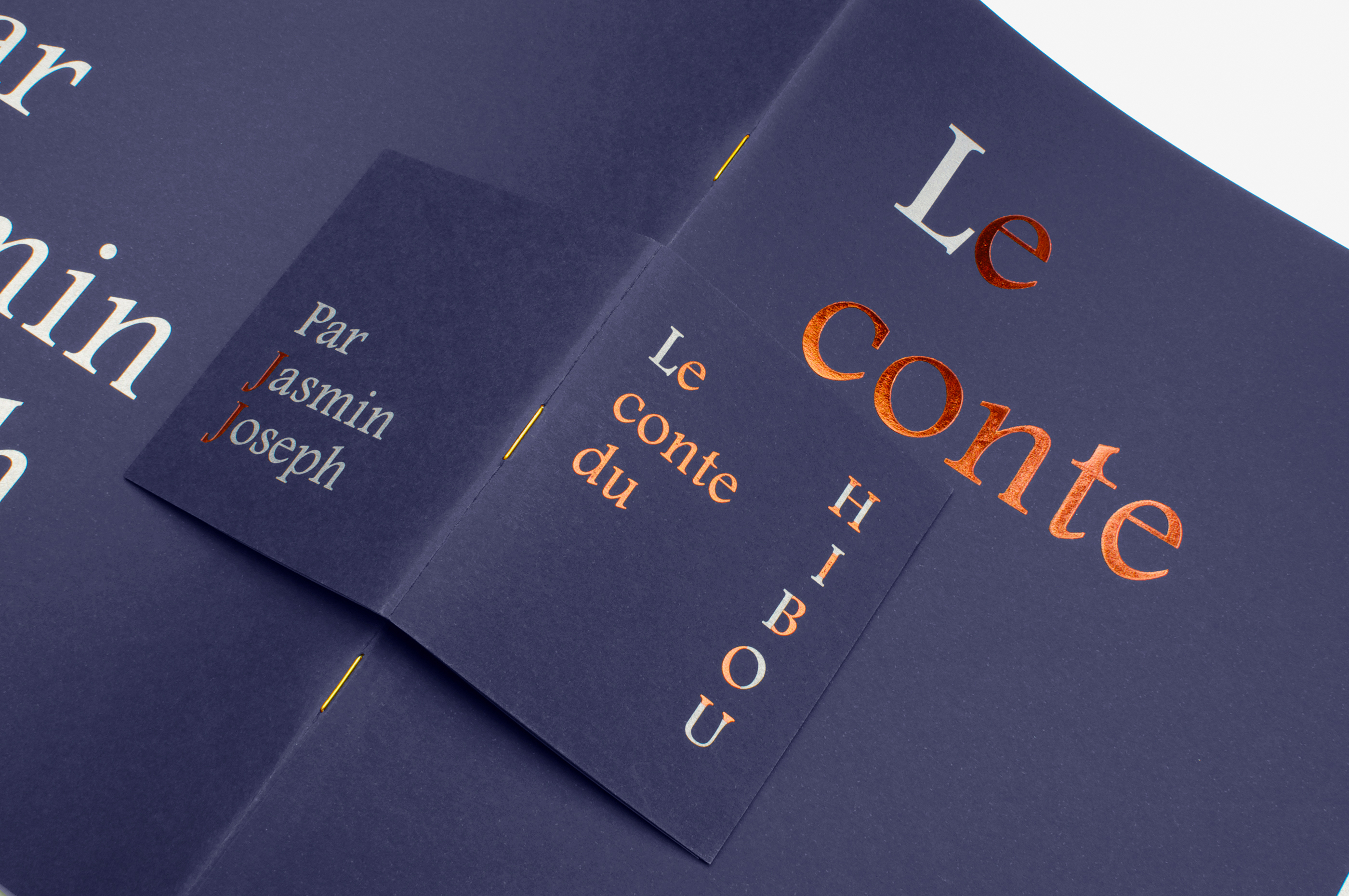 La fondation Facim m’a confié la conception éditoriale et graphique de ce livre de contes, écrit et illustré par l’artiste haïtien Jasmin Joseph. J’ai dû imaginer deux éditions en parallèle: d’une part, le livre à proprement parler, et d’autre part, une publication ludique et gratuite pour les enfants. J’ai répondu à cette contrainte par une équation originale, purement matérielle, liée à la question du format. Ainsi, Le Conte du hibou existe dans deux versions, imprimées en amalgame mais qui induisent par leurs formats un statut différencié. La mise en page répond à la contrainte inédite de la stricte homothétie de 1/3. L’immersion sensible dans l'histoire est facilitée par la couleur, dont le spectre nocturne constitue un écrin pour les peintures de l’artiste.