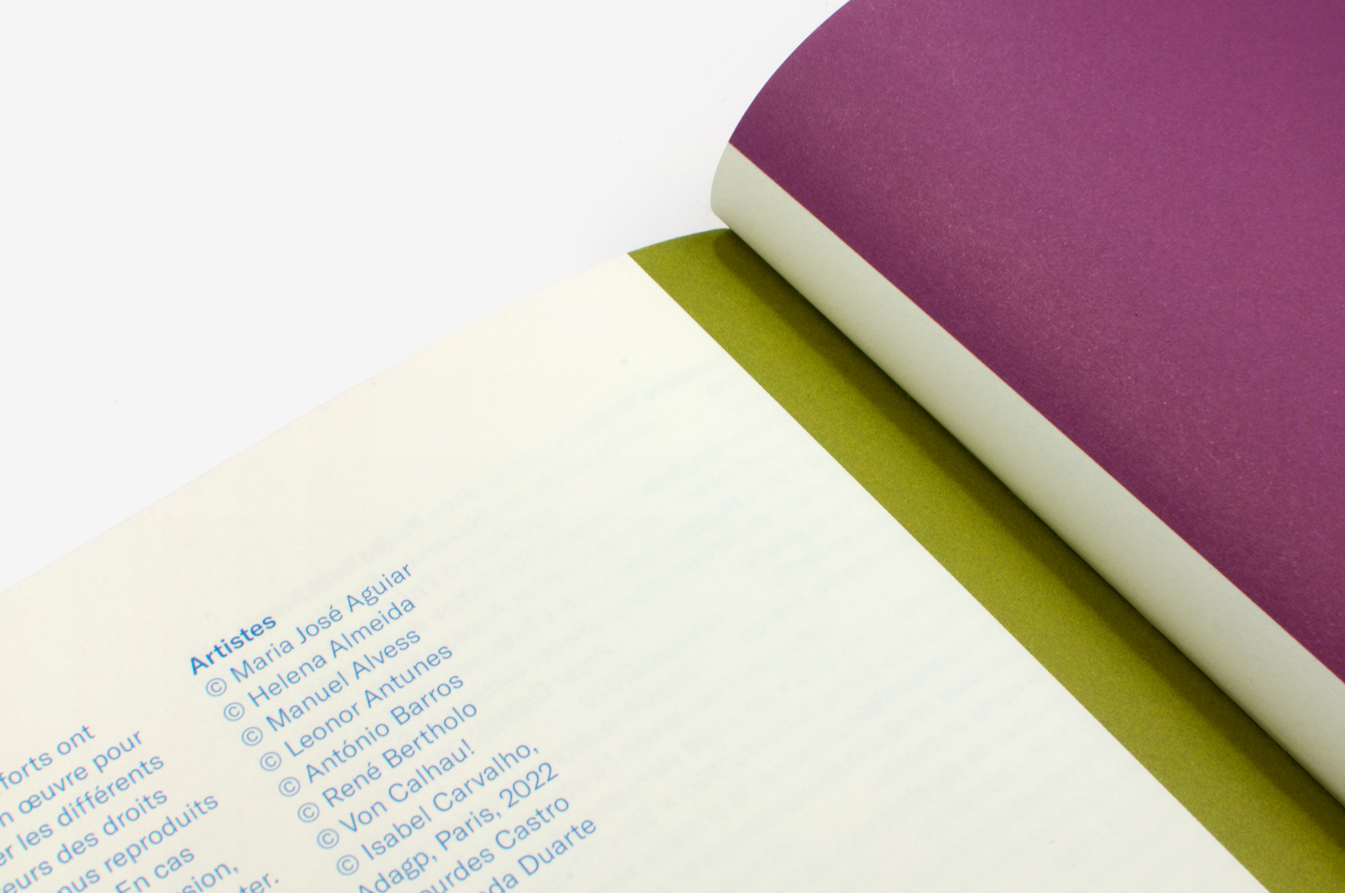 This exhibition conceived by Anne Bonnin presented an overview of Portuguese art from the 1960s to the present day The contrasting colour range of the exhibition catalogue is inspired by Portugal, and the typefaces (condensed or extended) evoke the literary magazines shown in the exhibition. On the cover, the layout of the title (taken from Rimbaud’s poem Le bateau ivre) juxtaposes the French and Portuguese words, split with hyphens. The flexible covers of the book allow the hot-stamped gold letters of the Portuguese title to shimmer.